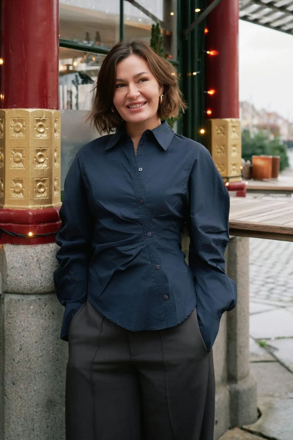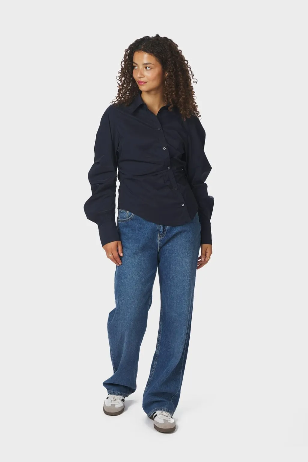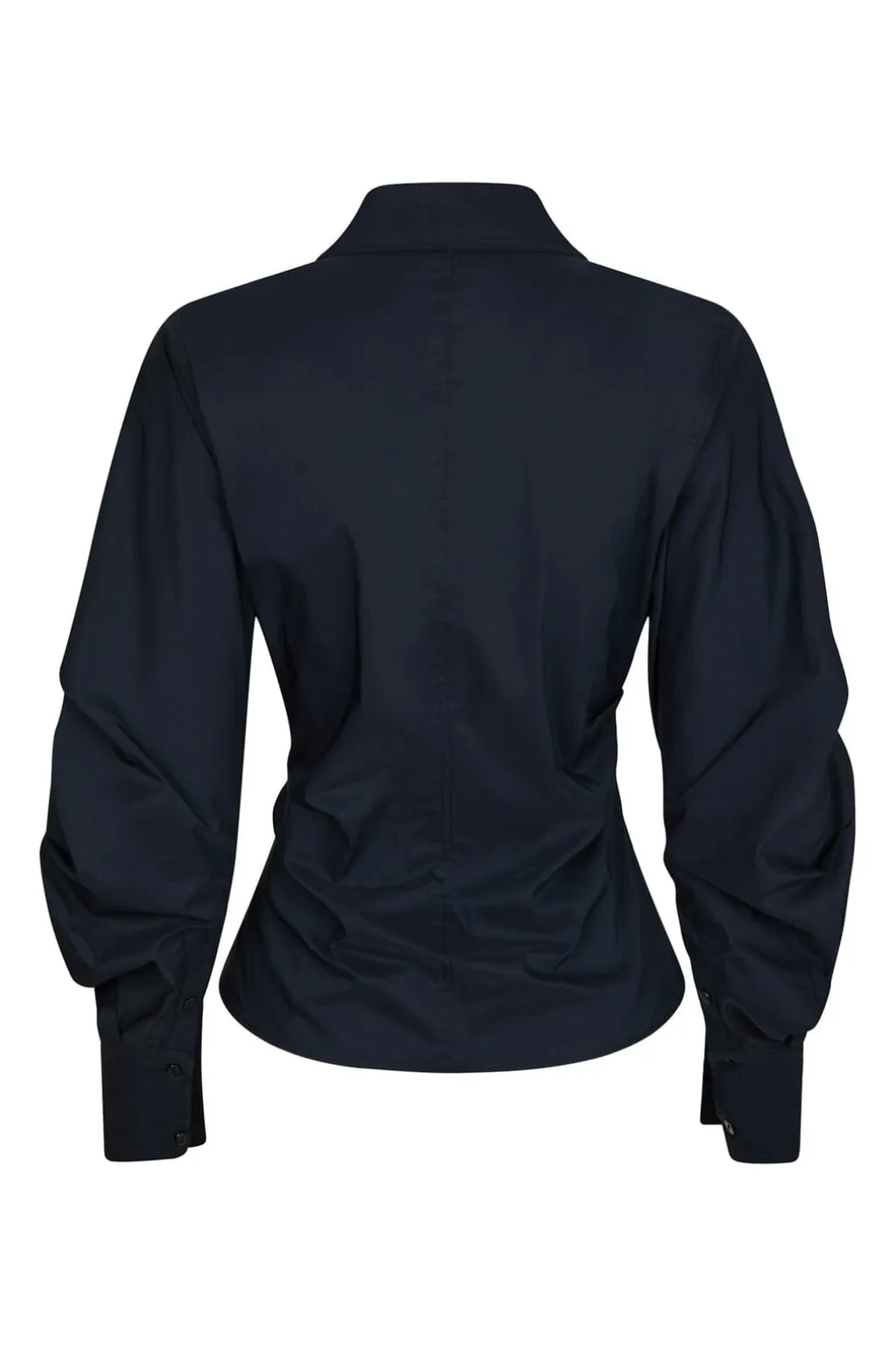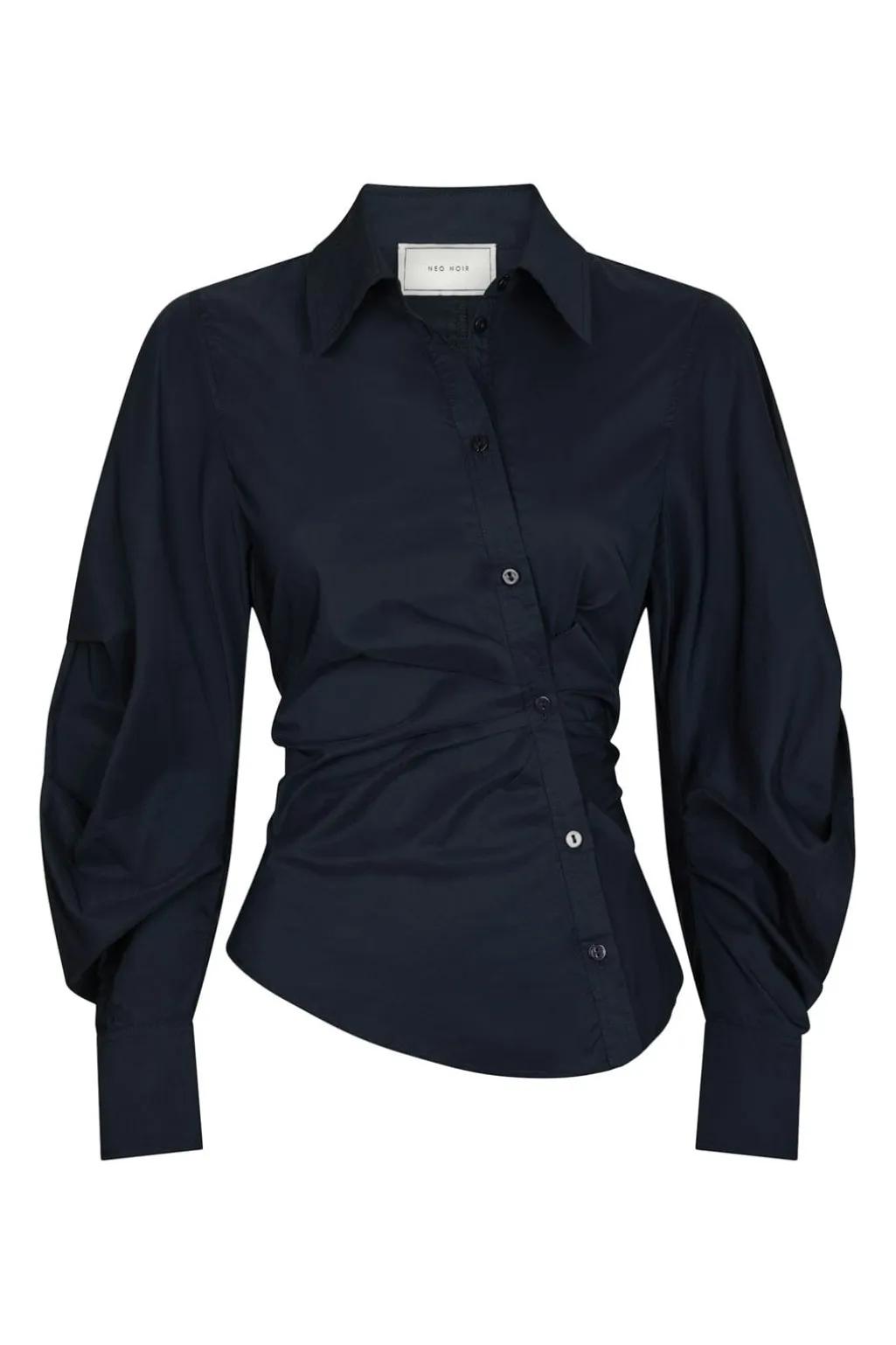 Mørkeblå skjorte fra Neo Noir med asymmetrisk knaplukning foran. Skjorten har en slim fit-pasform og rynkede detaljer ved taljen samt lange ærmer med puf.