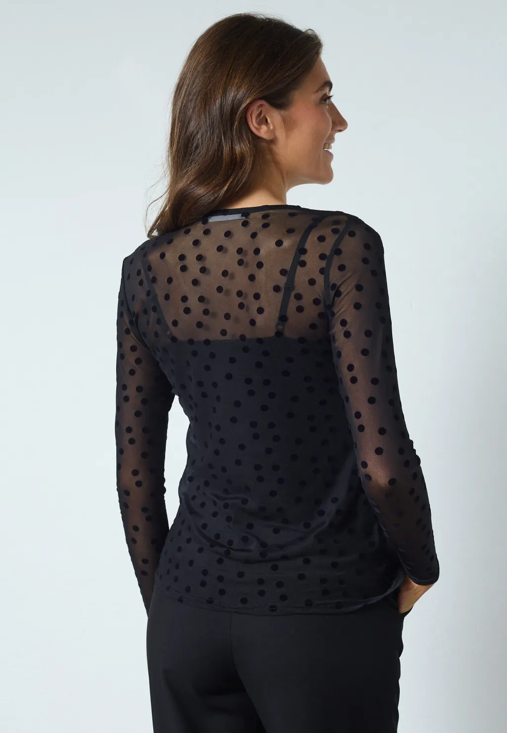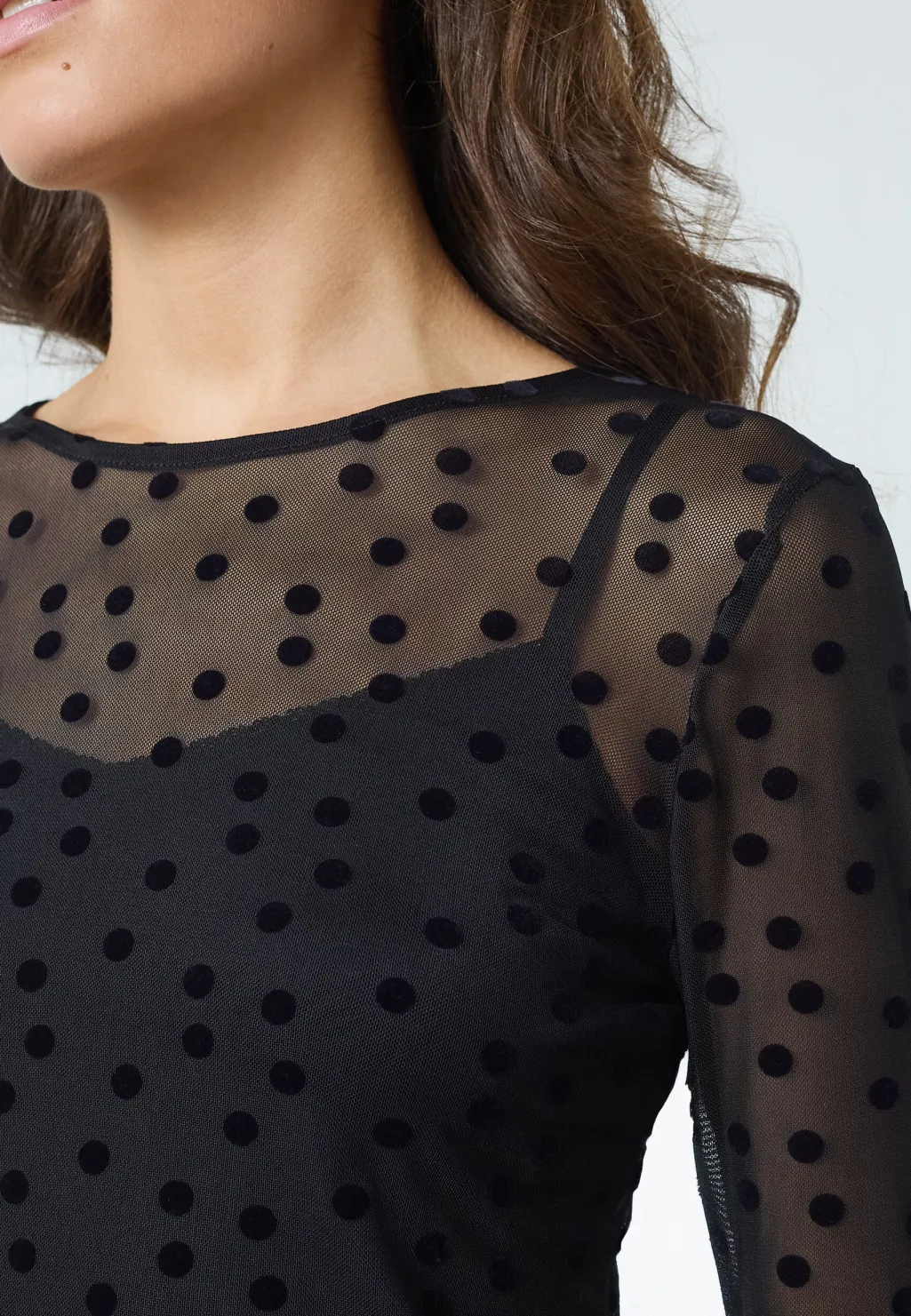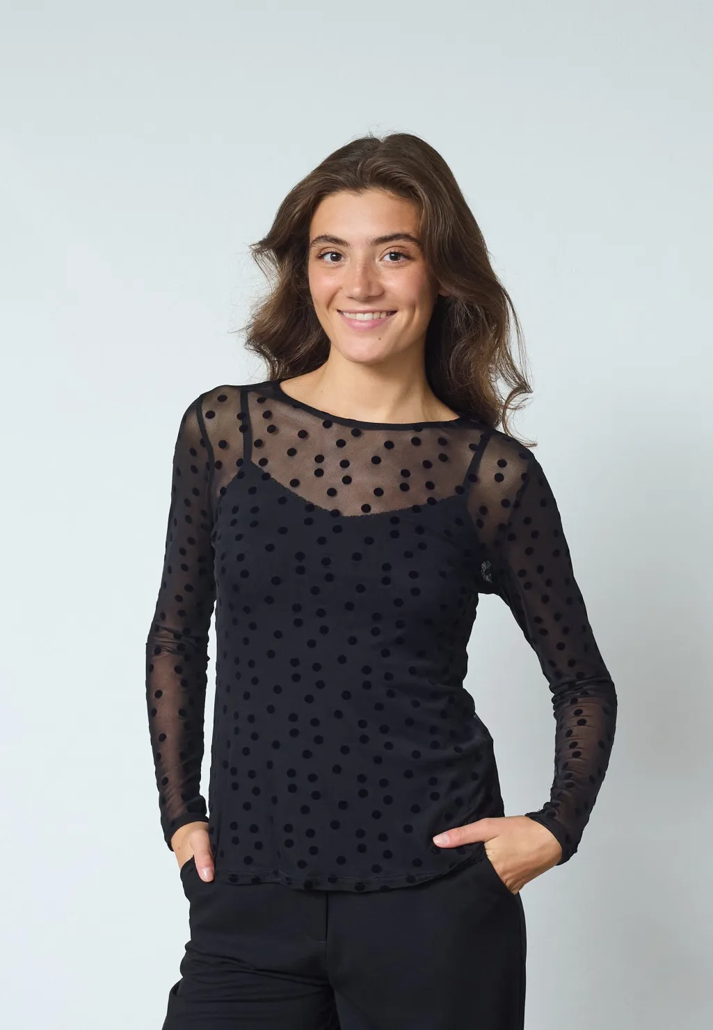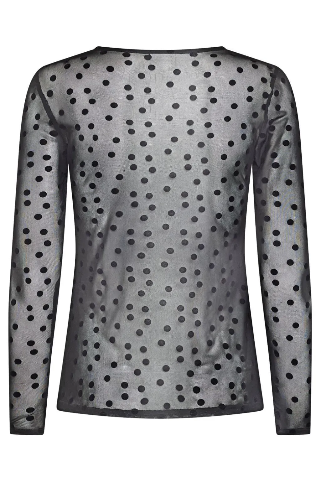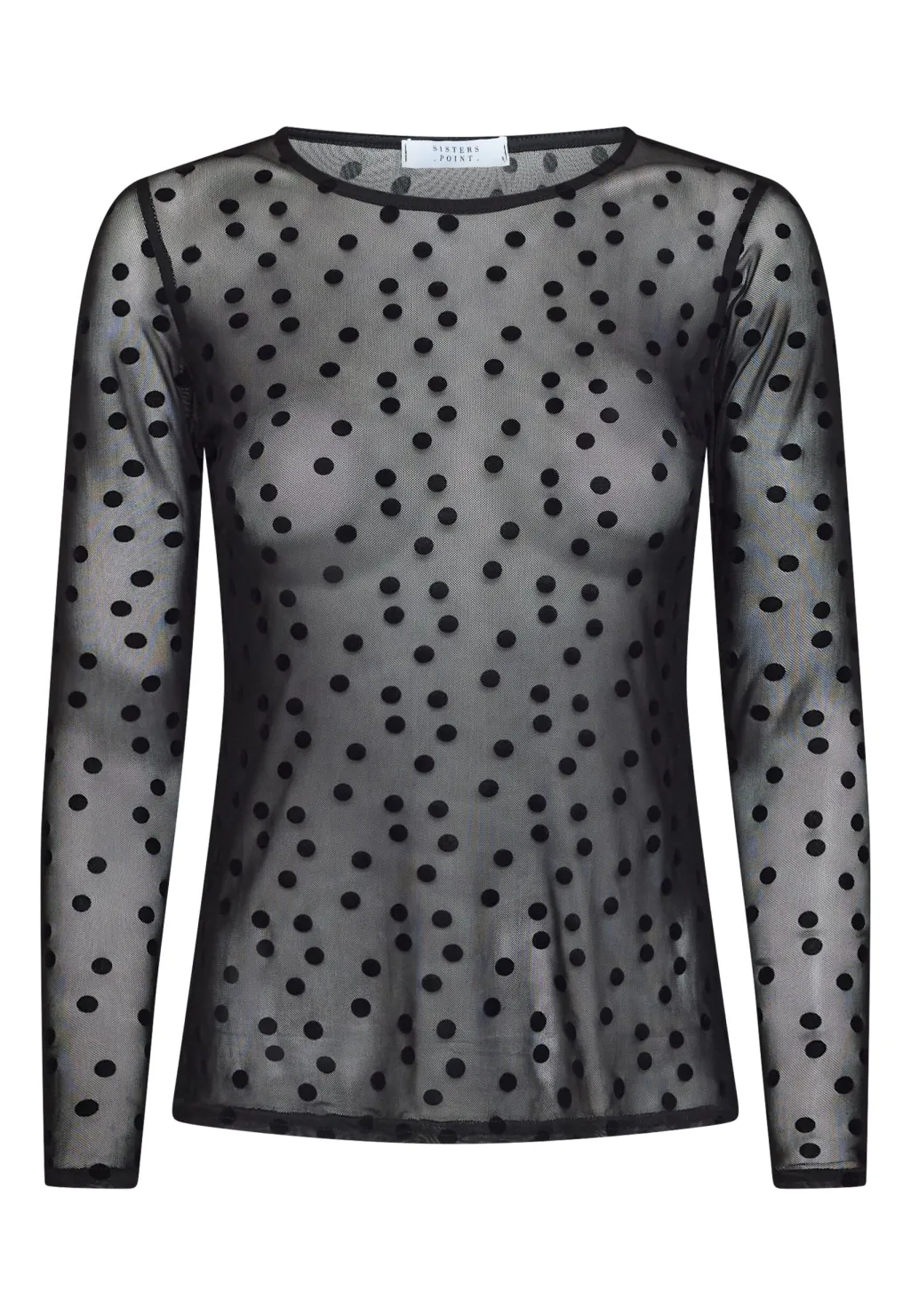 En langærmet bluse fra Sisters Point i gennemsigtigt mesh med sorte prikker. Blusen har en tætsiddende pasform og en rund halsudskæring.