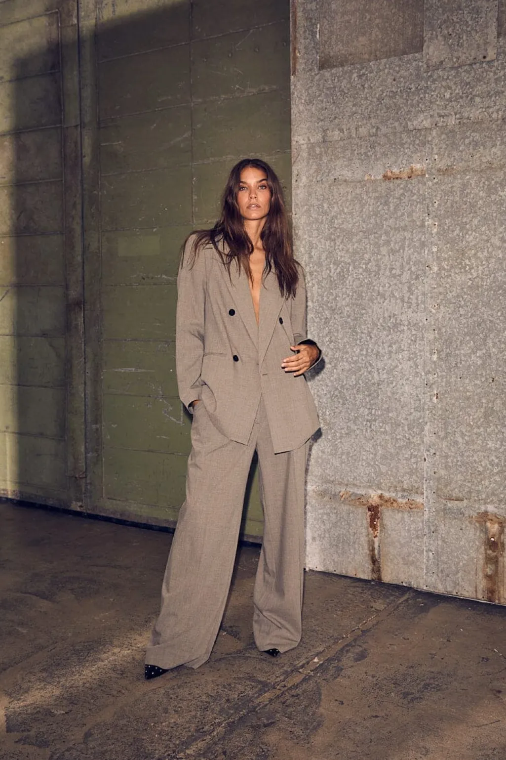 Bukser fra Haute L’Amitié i beige melangé. Høj talje, gulvlængde og løs pasform giver et klassisk look med læg foran.