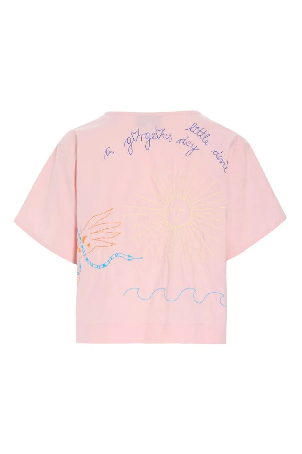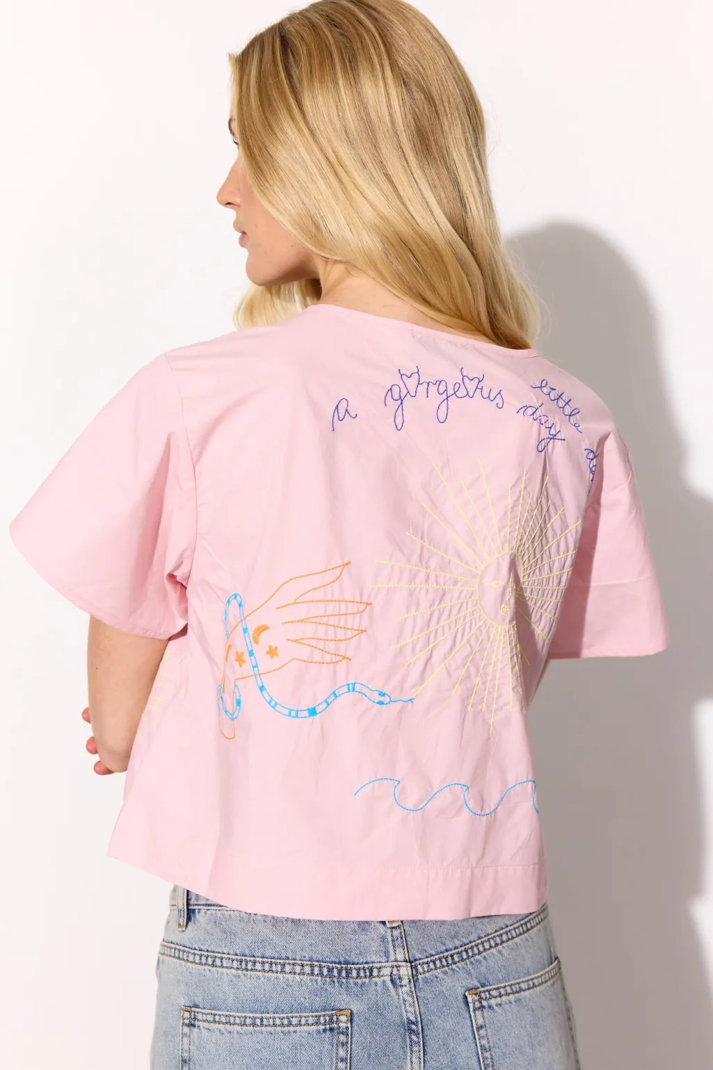 Lyserød skjorte fra Hunkøn med korte ærmer og broderede motiver. Den har bindebånd foran og et flerfarvet design.