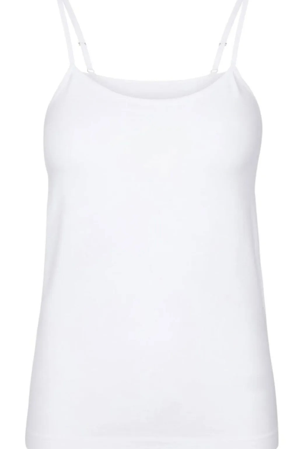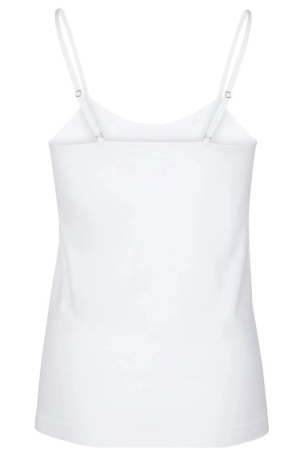 Hvid top fra Liberte med tynde stropper og rund hals. Toppen har en slim fit-pasform og er lavet af et blødt og stretchy stof, der giver god bevægelsesfrihed.
