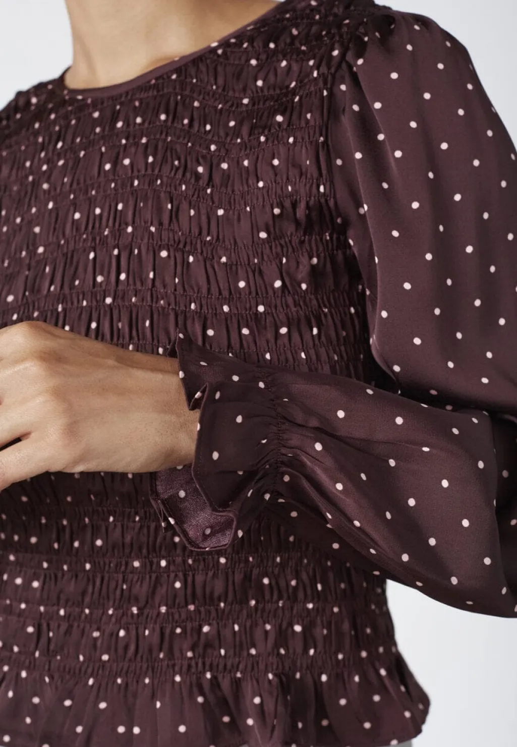 Bordeaux-bluse fra Sisters Point med et prikket mønster. Blusen har dekorative syninger, rynker og flæser, der giver den et detaljeret udtryk.