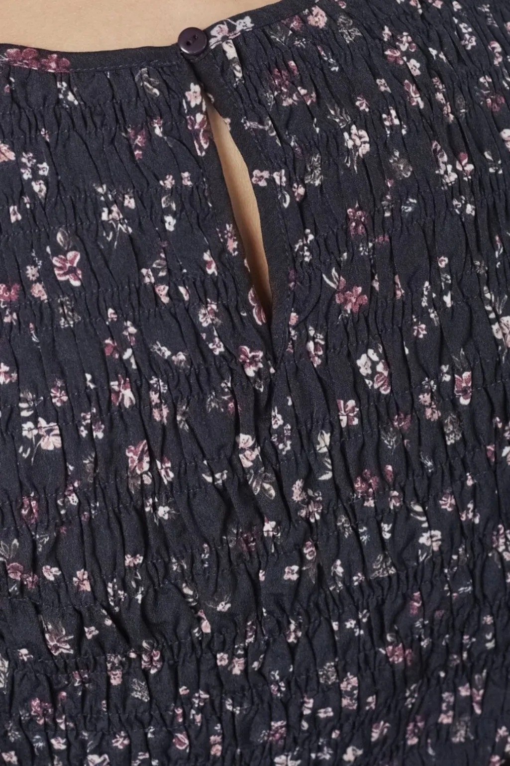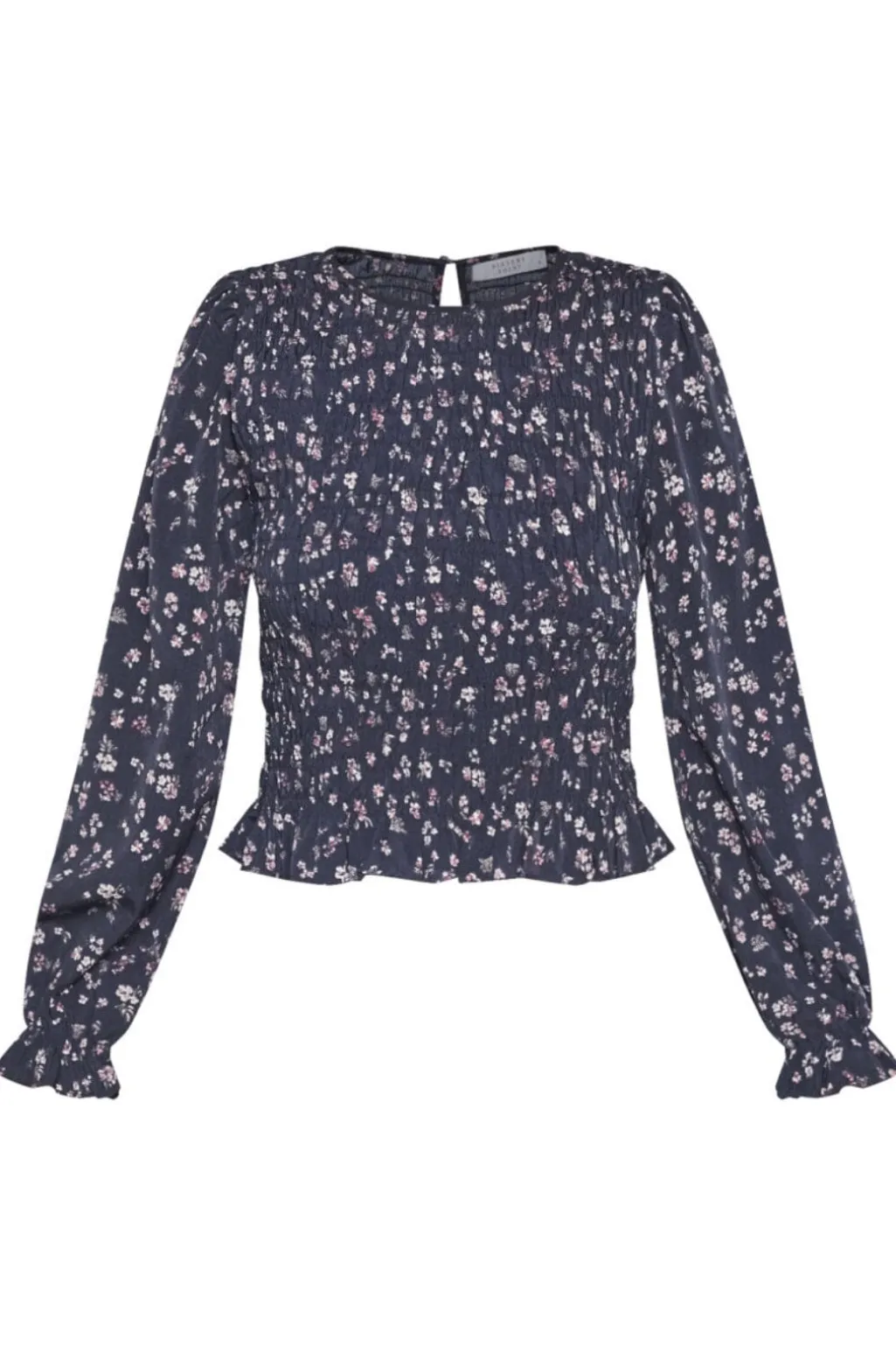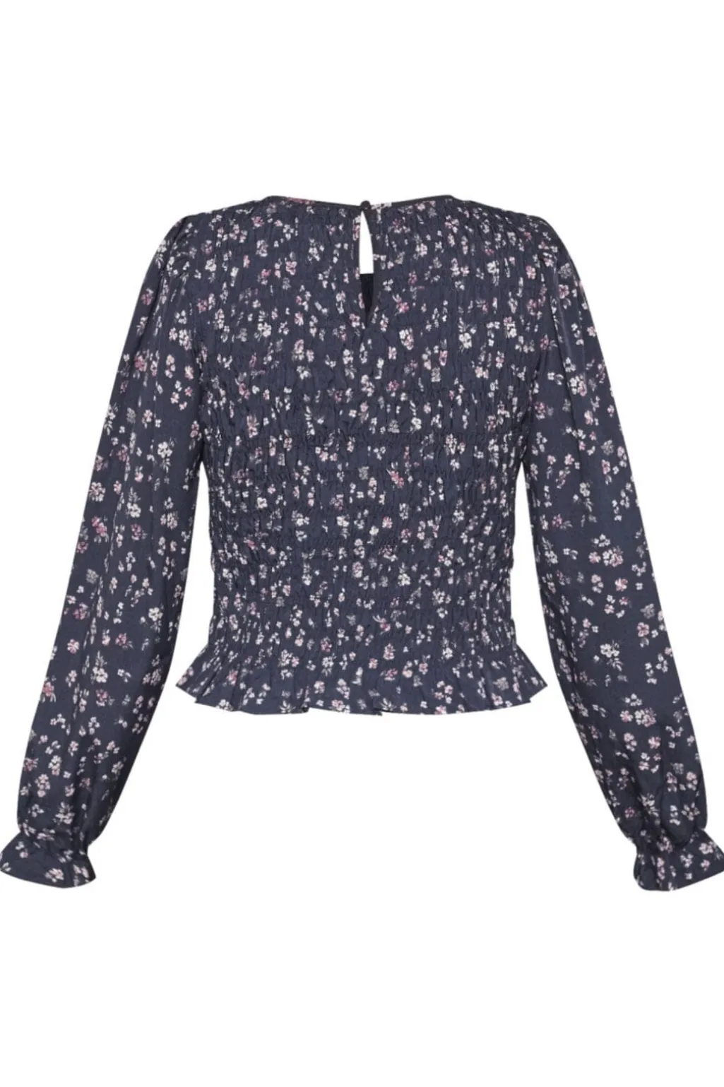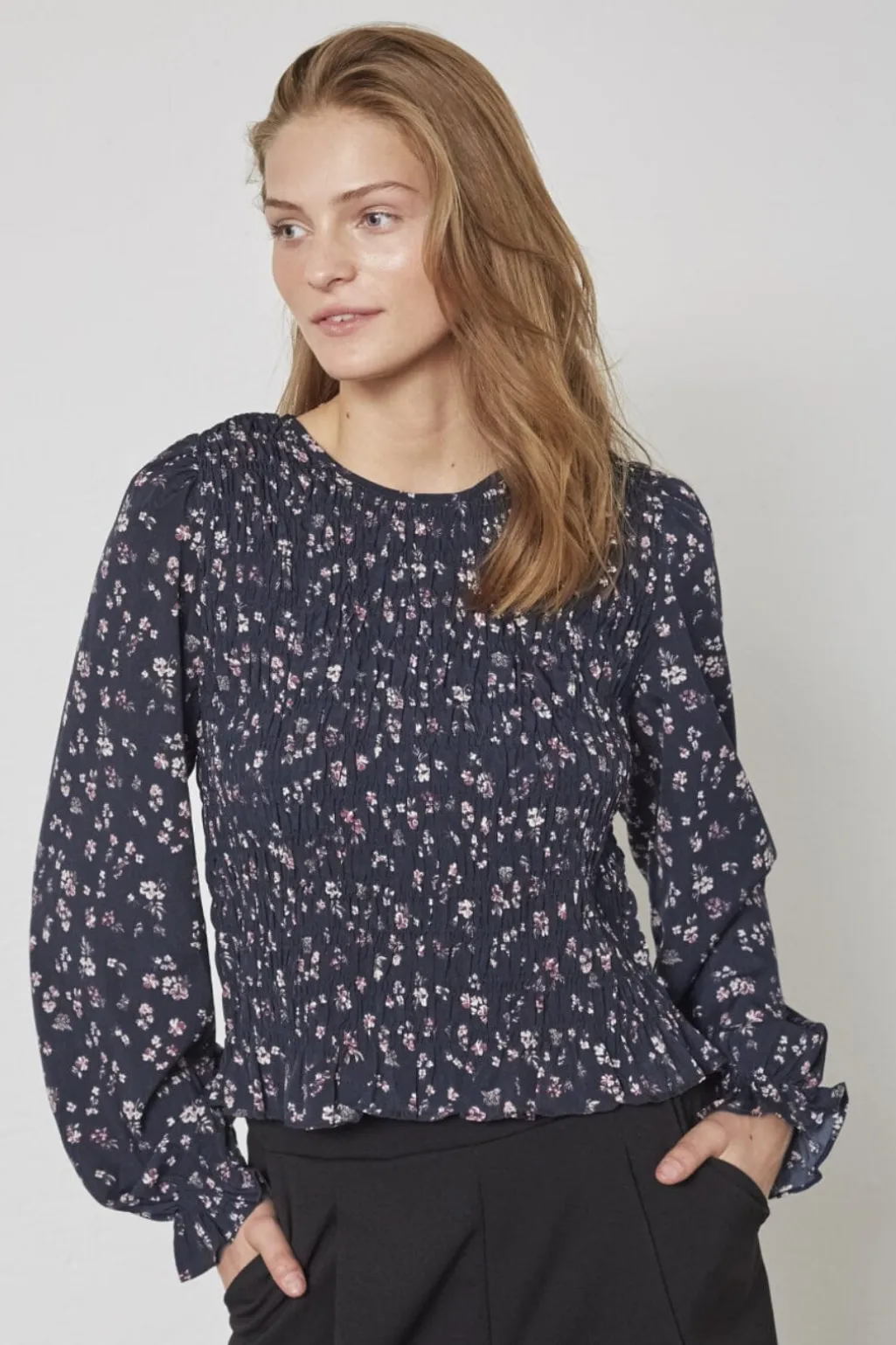 Bluse fra Sisters Point i mørkeblå med småblomstret print i lyse og mørke nuancer. Blusen har smocksyninger foran og bagpå.