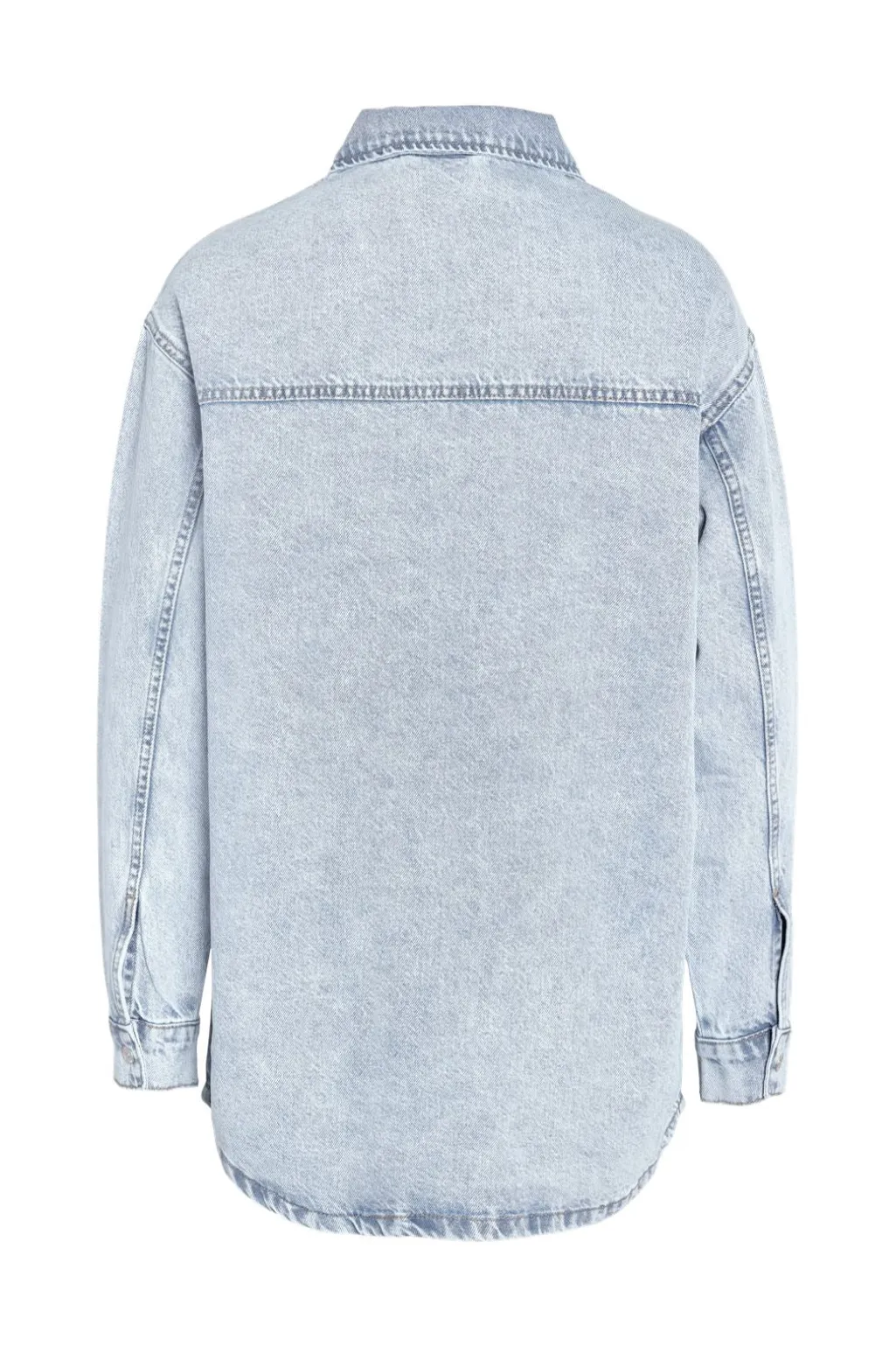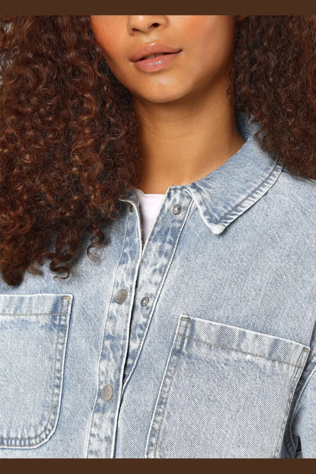 Lyseblå denim shacket fra Noisy May i 100% bomuld. Jakken har en klassisk skjortekrave, knaplukning foran og to brystlommer.