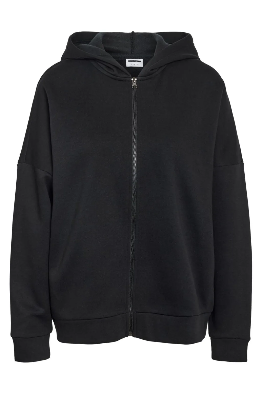 Sort hoodie fra Noisy May, lavet af en bomuldsblanding. Hoodie’en har en oversized pasform og lynlås foran med fastsyet hætte.