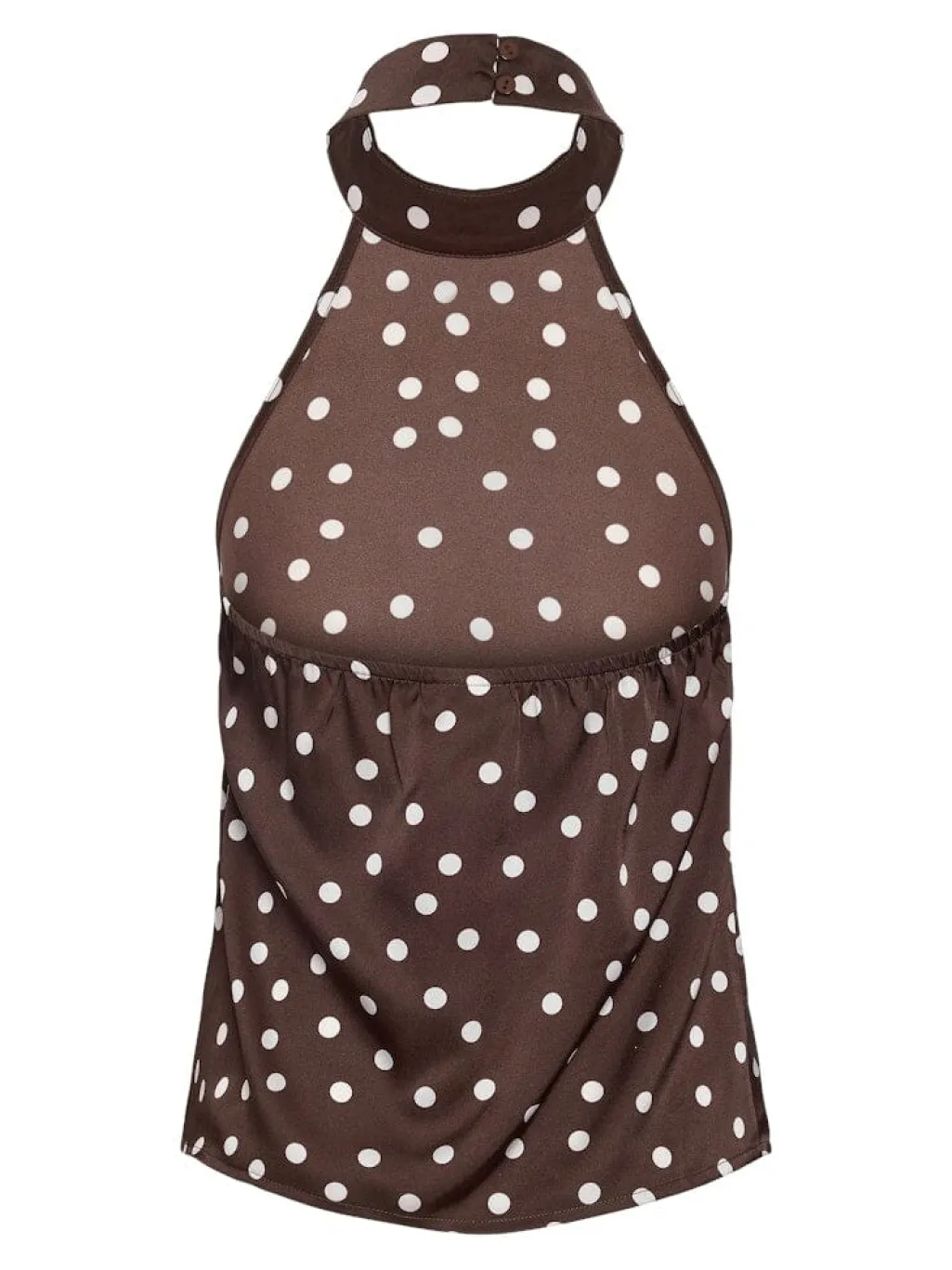 Halterneck-top fra Noisy May i chokoladebrun med hvide polkaprikker. Toppen er lavet af satin-polyester og har en høj halsudskæring med knaplukning på ryggen.