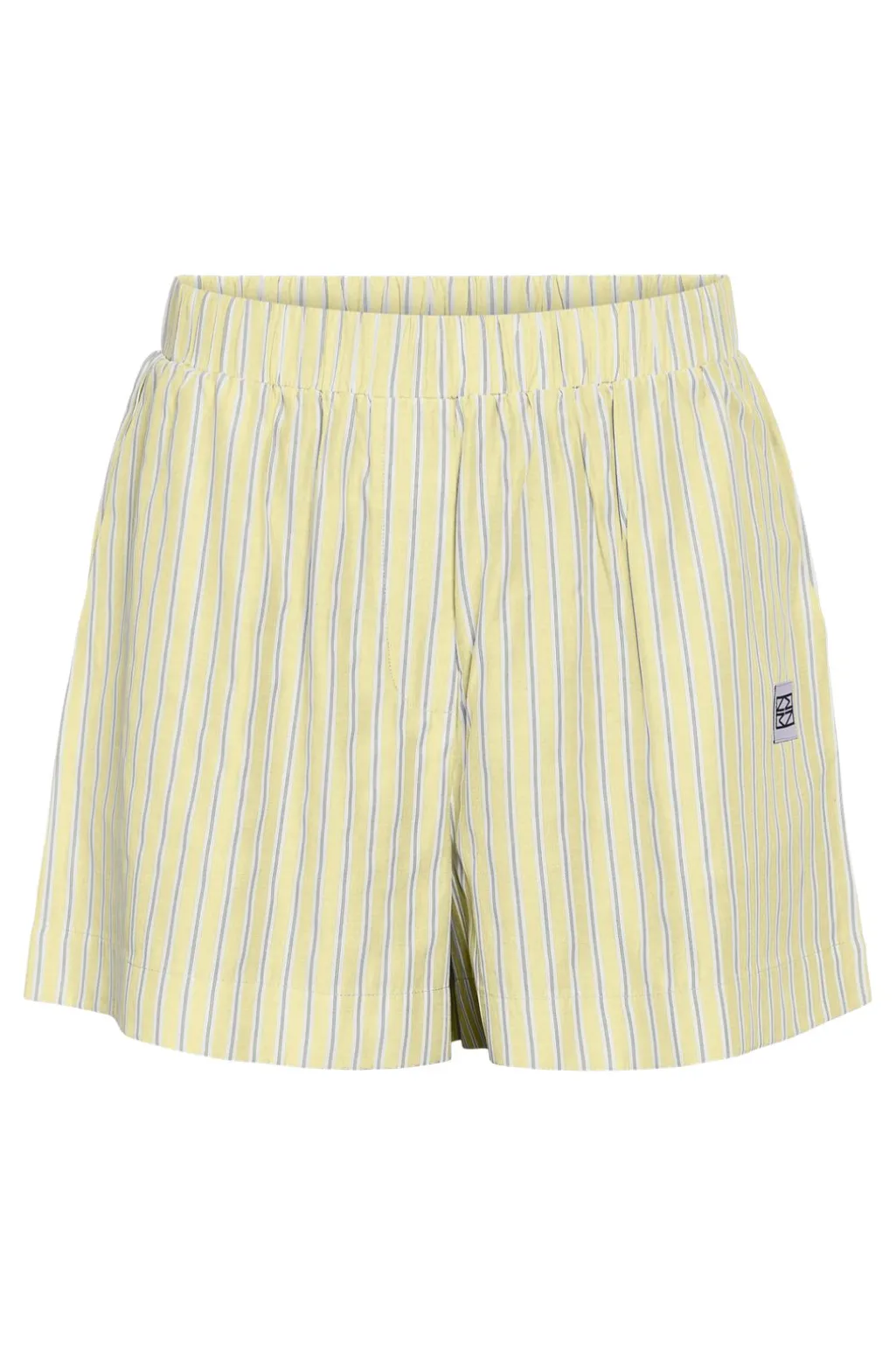 Stribede shorts fra Noisy May med lodrette striber i hvid og blå på en pastelgul baggrund. Shortsene har en regular talje og en regular pasform.