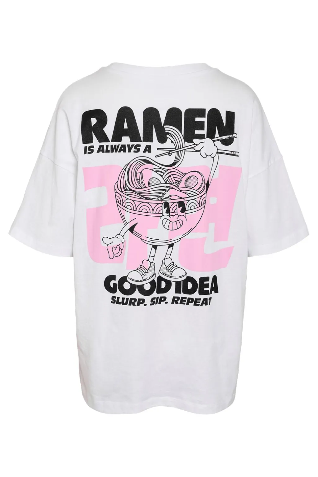 Hvid T-shirt fra Noisy May med et legende ramen-print på bagsiden. Forsiden er enkel og uden synlige designs, mens bagsiden har en stor grafisk illustration af en tegneserie-ramenskål.