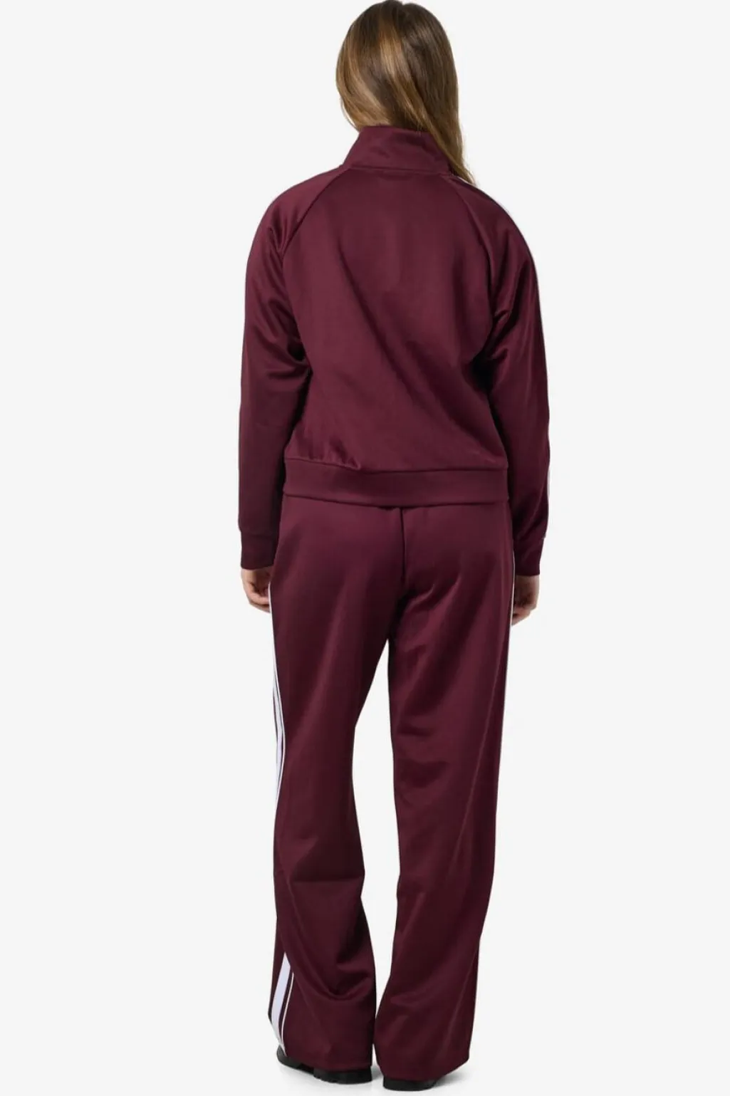 En stribet jakke fra Noisy May i mørk vinrød med hvide striber langs ærmerne. Jakken har høj hals og lynlås foran.