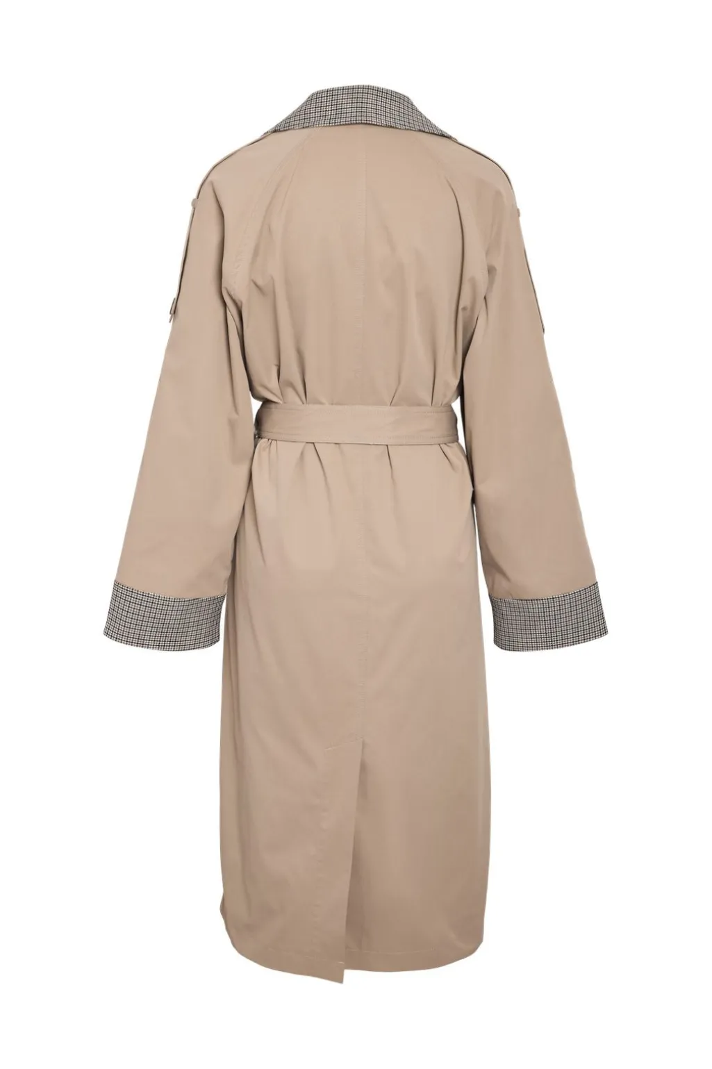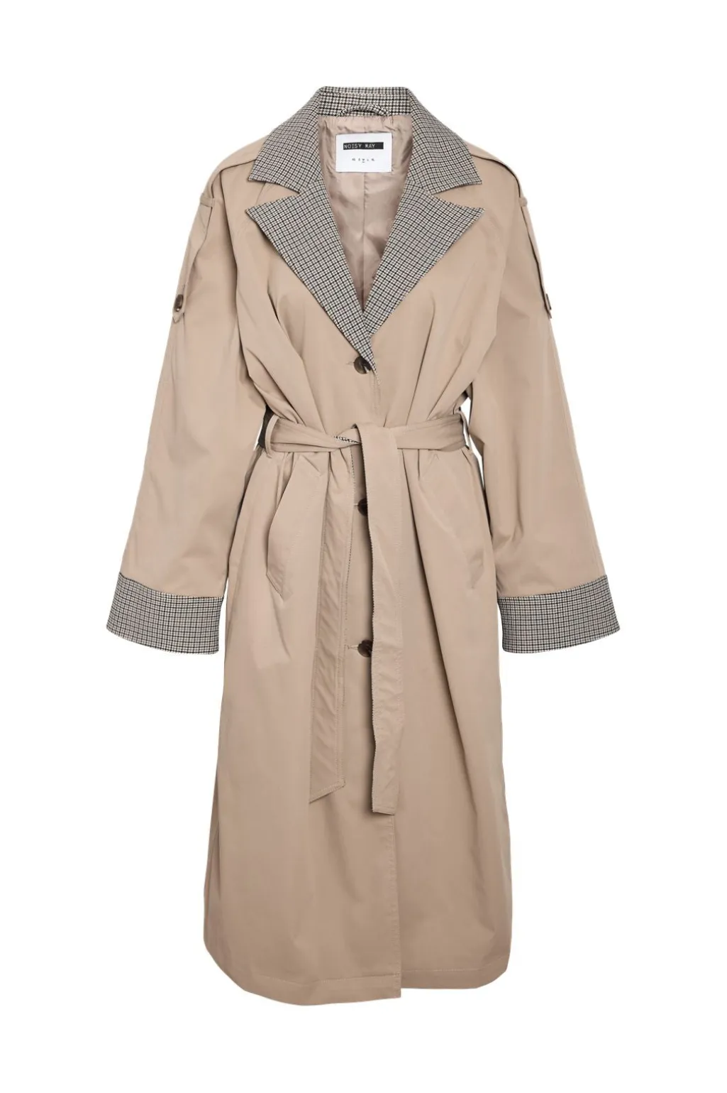 Trenchcoat fra Noisy May i beige med tern på kraven og ærmekanterne. Fremstillet af 100% polyester med en knælang længde.