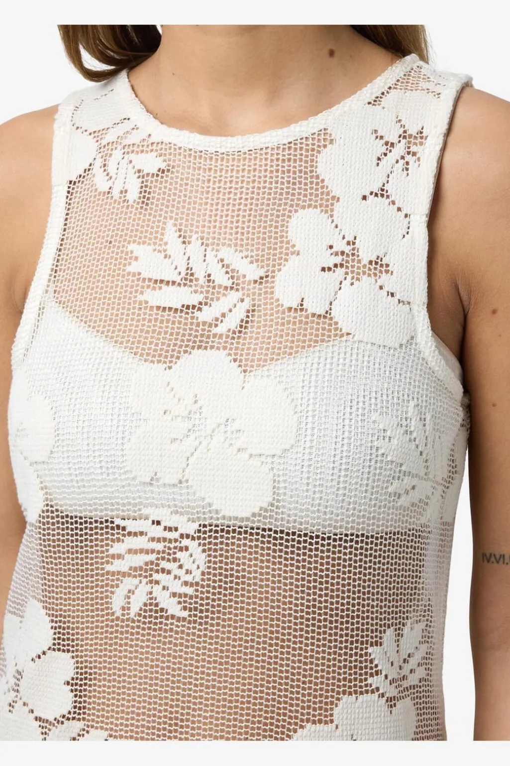 Lang kjole fra Noisy May, lavet af blonde i en lys beige nuance. Kjolen har et blomsterprint over hele overfladen.