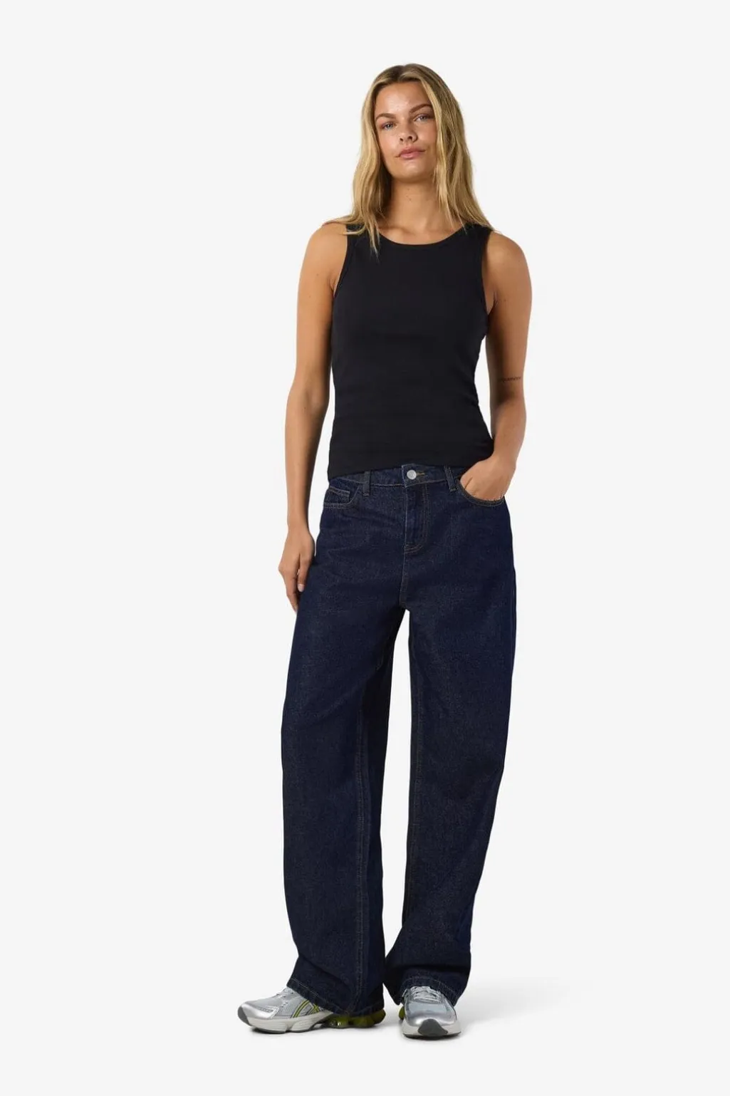 Sort tanktop fra Noisy May med ærmeløst design og rund halsudskæring. Tætsiddende pasform i blød bomuld med stretch.