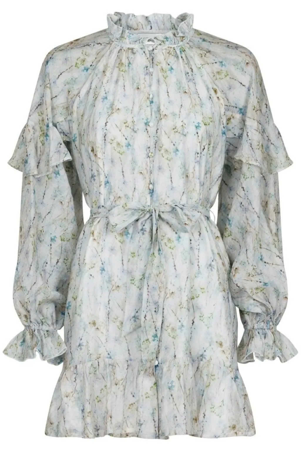 Lys blå kjole fra Neo Noir med blomsterprint i lyseblå og grønne nuancer. Kjolen har høj hals med flæsekant, lange ærmer med flæser og bindebånd i taljen.