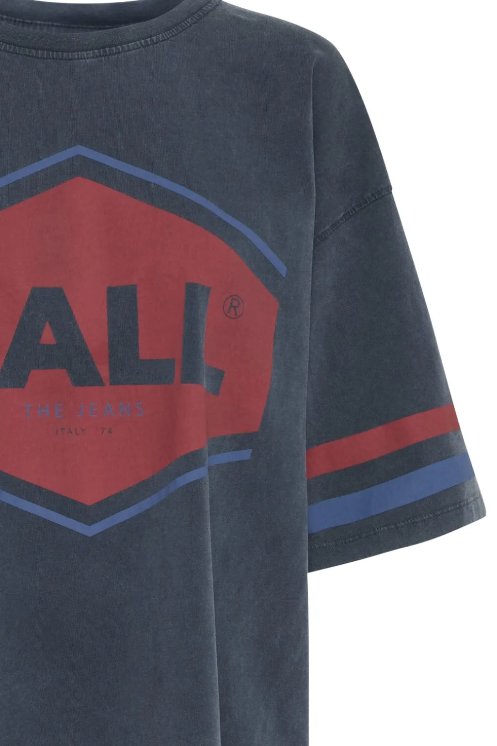 T-shirt fra Ball i mørkeblå med røde og blå striber på ærmerne. Forsiden har et stort Ball-logo samt teksten THE JEANS og ITALY 74 i et grafisk design.