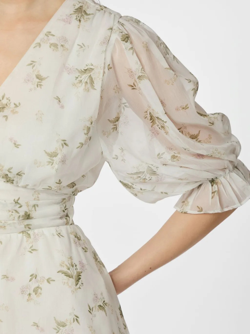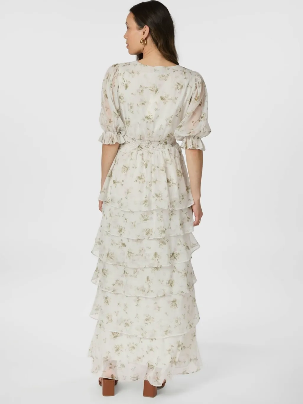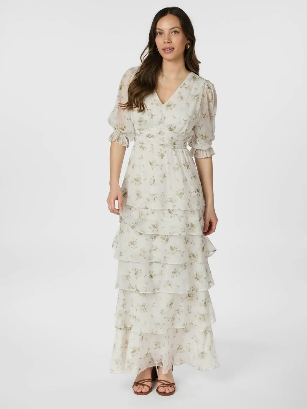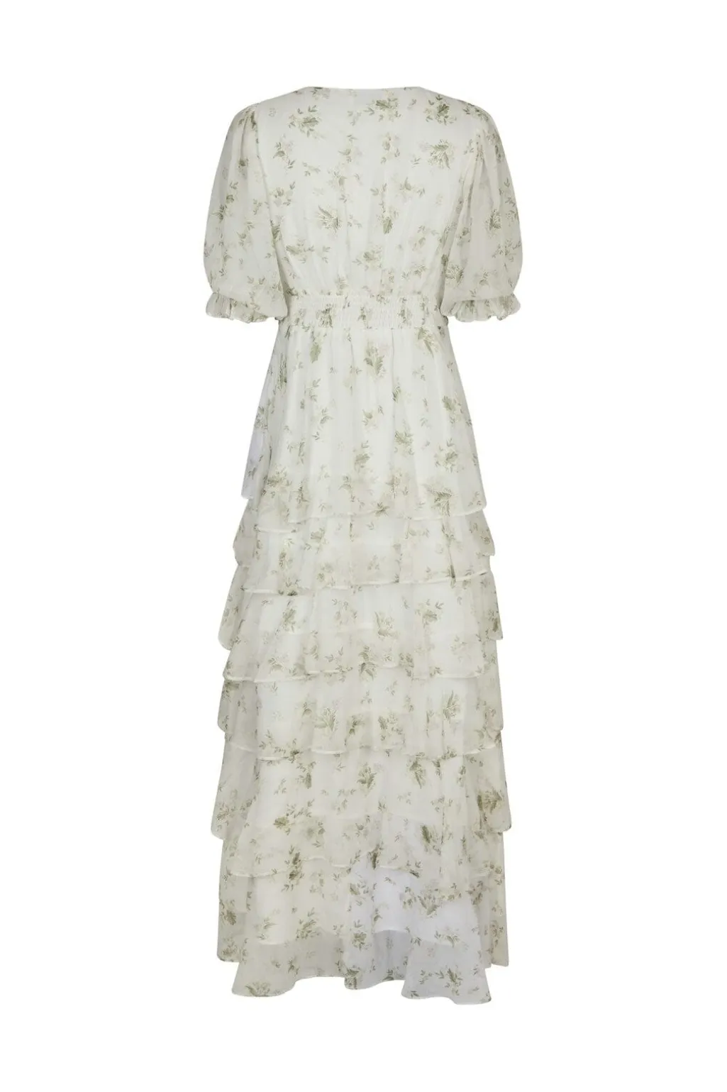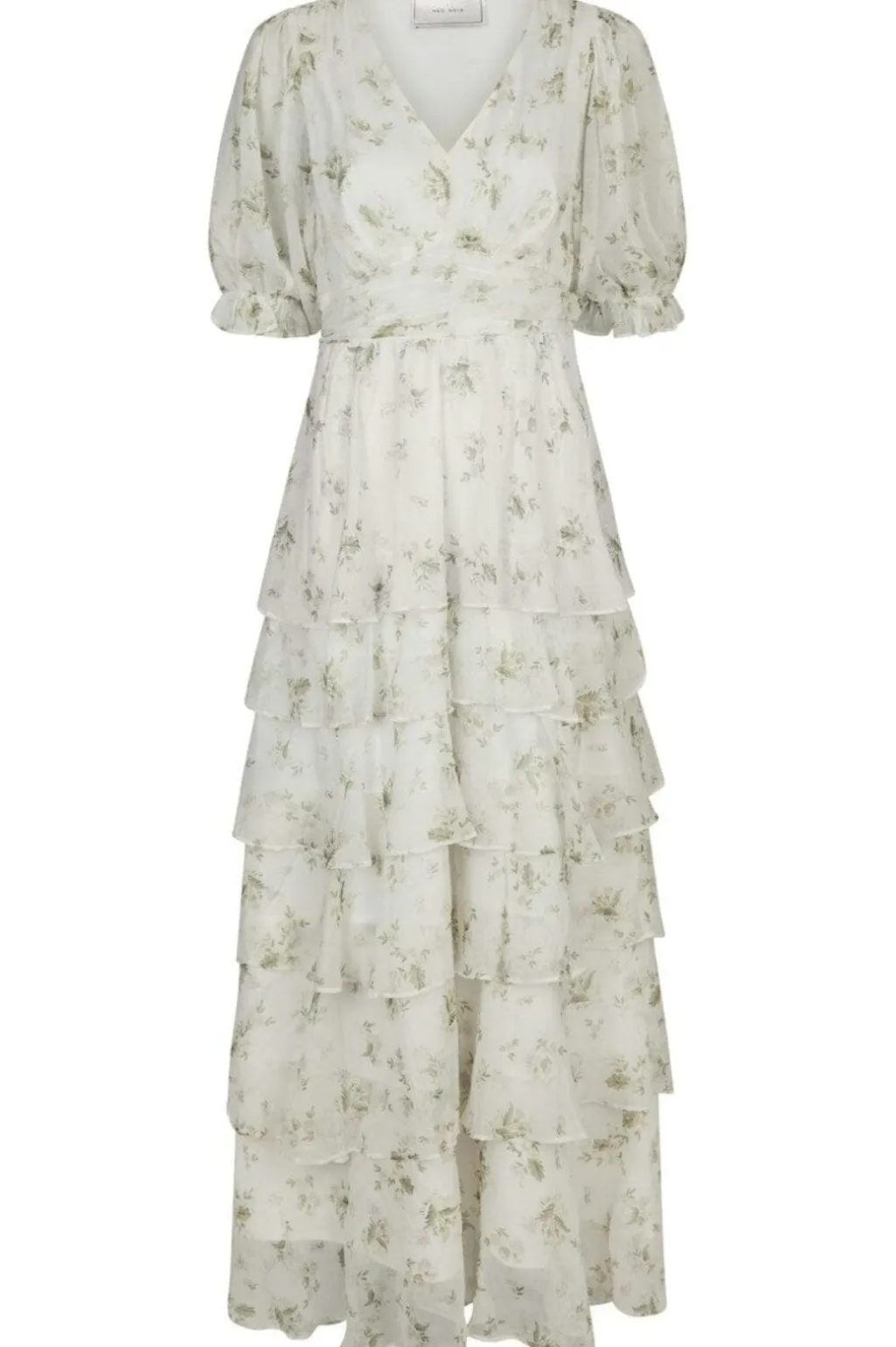 Lang kjole fra Neo Noir i off-white med grønt blomsterprint. Kjolen har v-udskæring og 3/4 ærmer. De mange lag af volanger giver kjolen struktur og bevægelse.