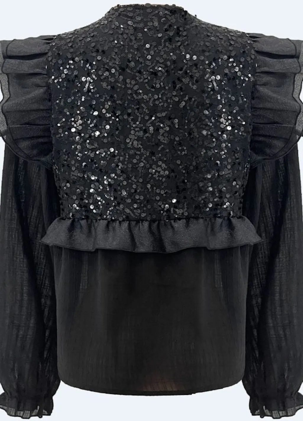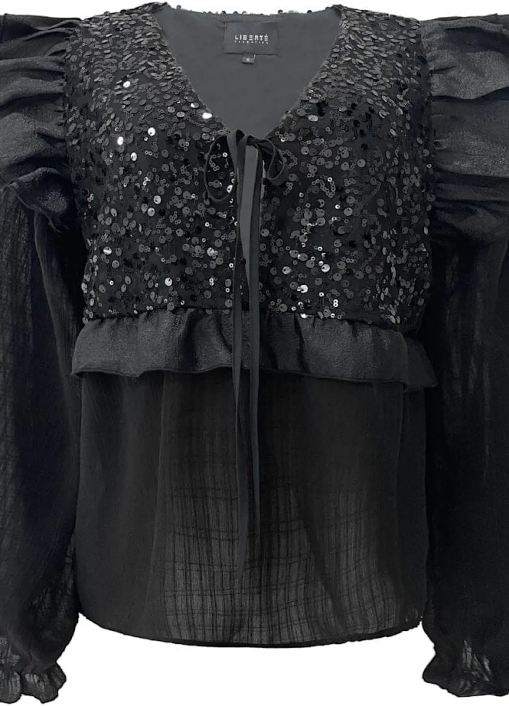 Sort bluse fra Liberte med skinnende pailletter på fronten. Blusen har lange gennemsigtige ærmer med flæsedetaljer ved skuldrene og en justerbar snor ved halsudskæringen.