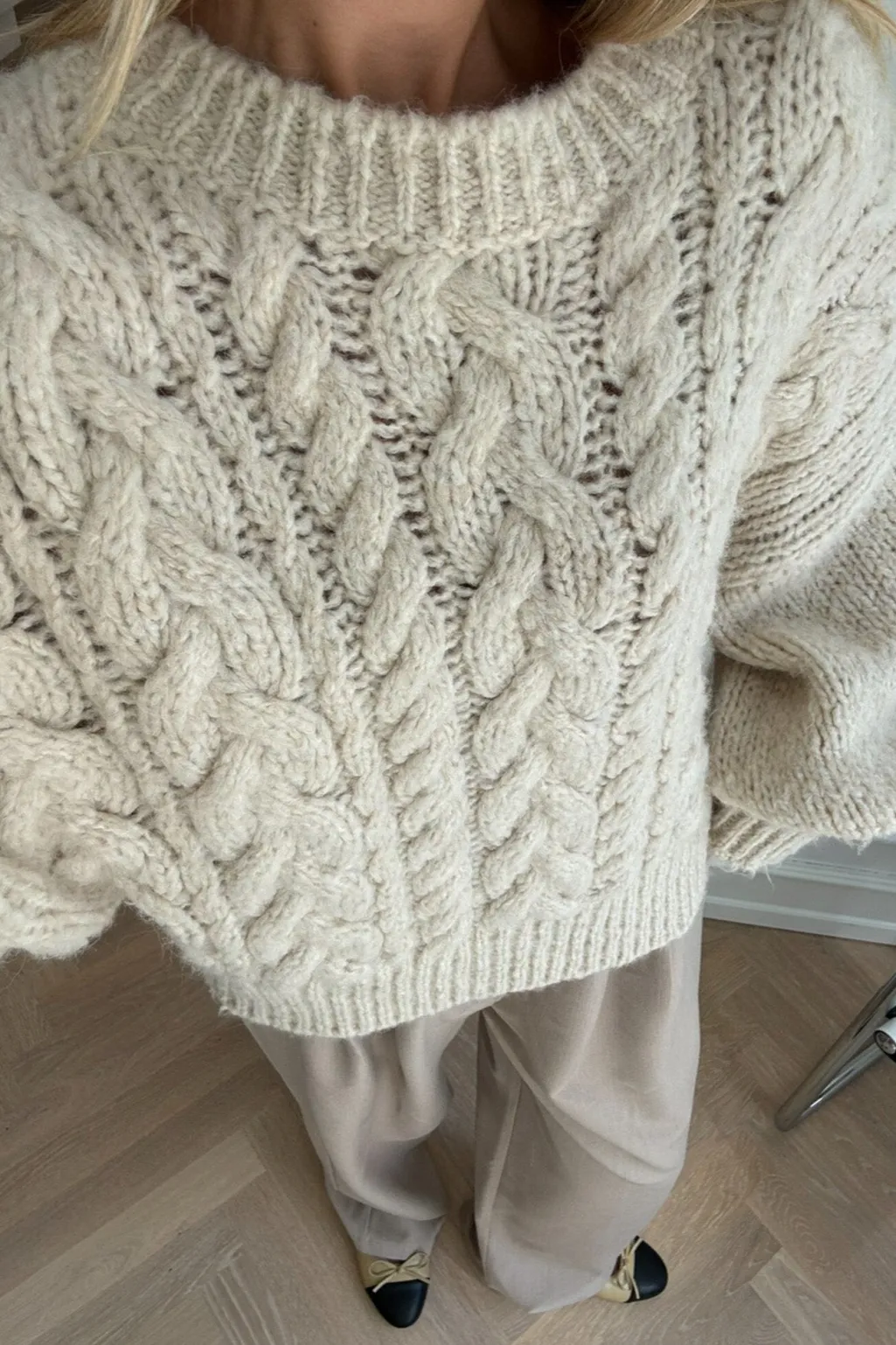 Off-white sweater i chunky strik fra BYIC. Kabelmønstret og ballonærmerne skaber et strikdesign med tydelig struktur og karakter.