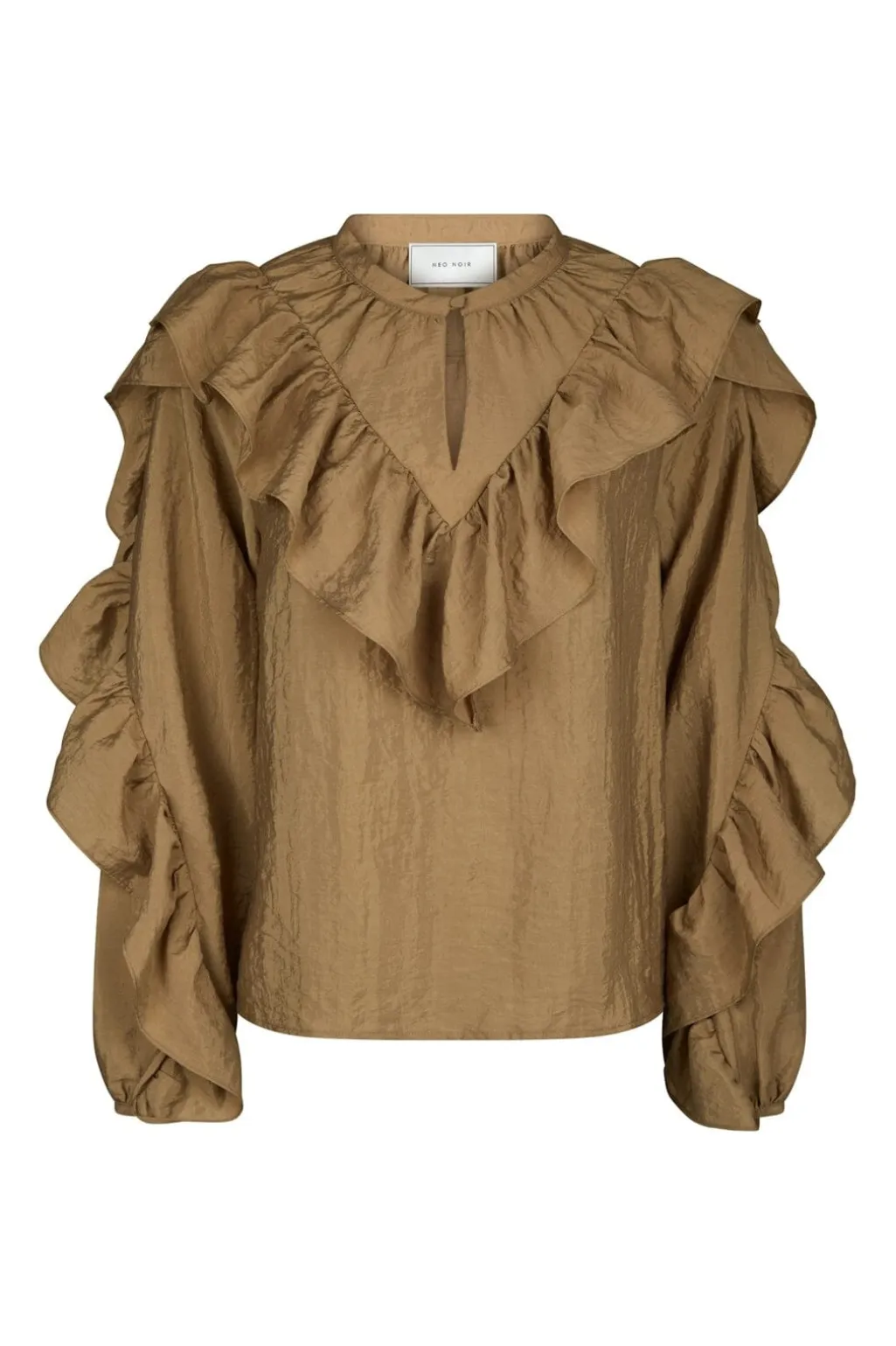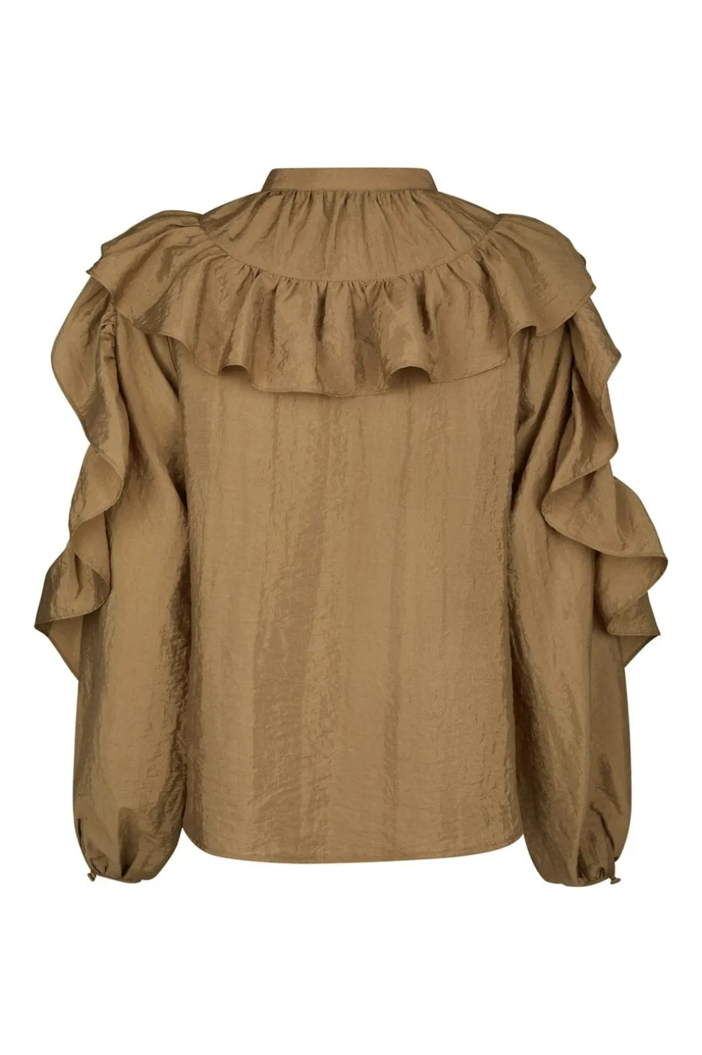 Sandfarvet bluse fra Neo Noir med flæsedetaljer. Blusen har en løs pasform og V-hals med flæsekant. De lange ærmer har voluminøse flæser langs siderne.