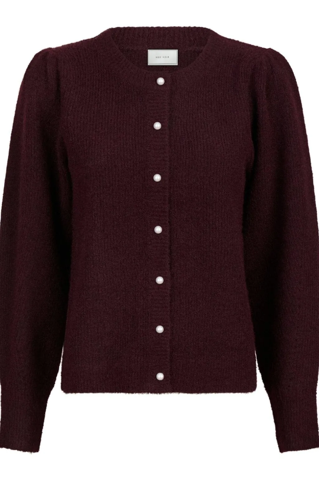 Strikket cardigan fra Neo Noir i en dyb vinrød nuance. Den har rund hals og perlemorsknapper på forsiden. Den bløde strik giver en behagelig pasform.