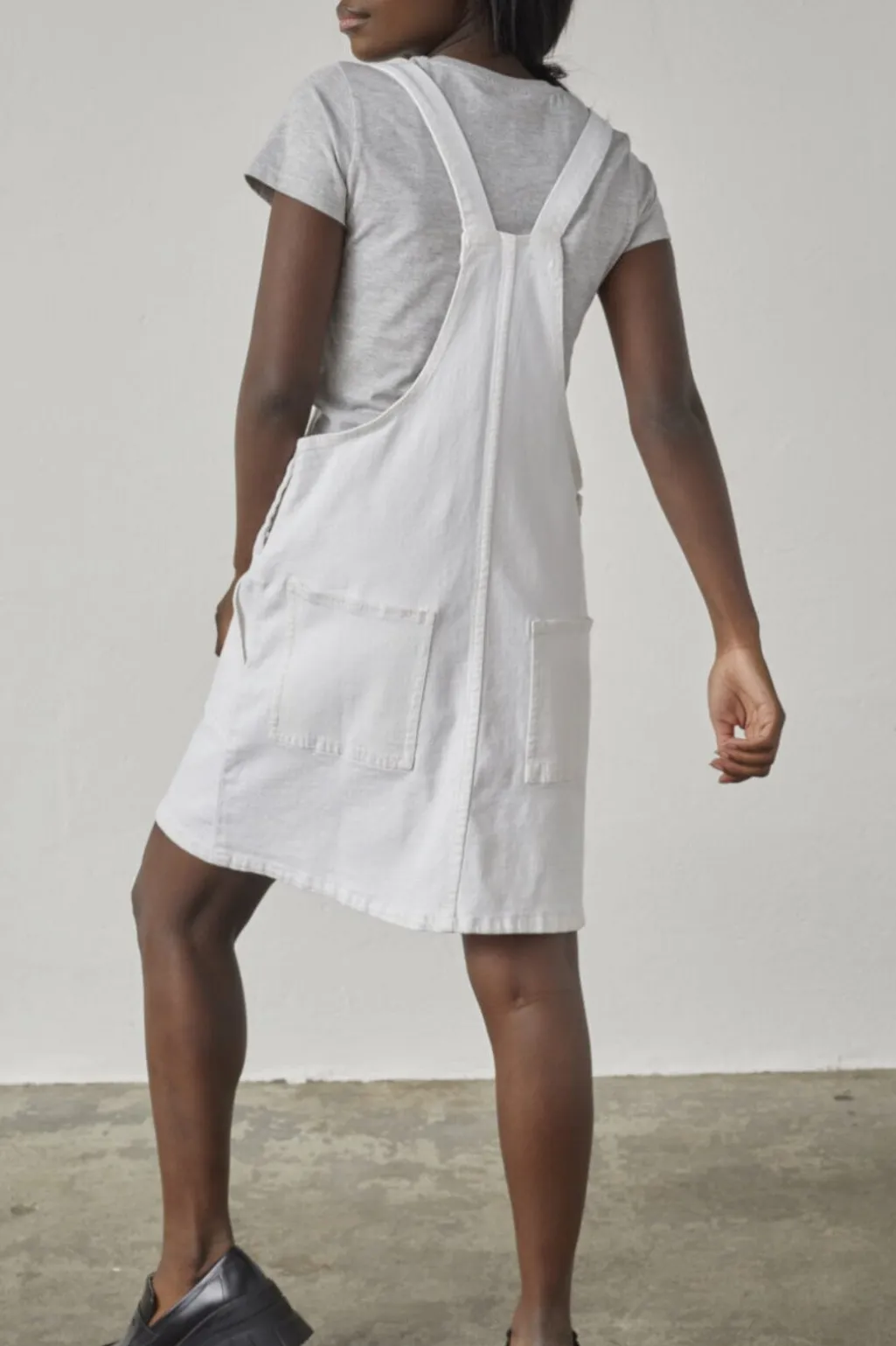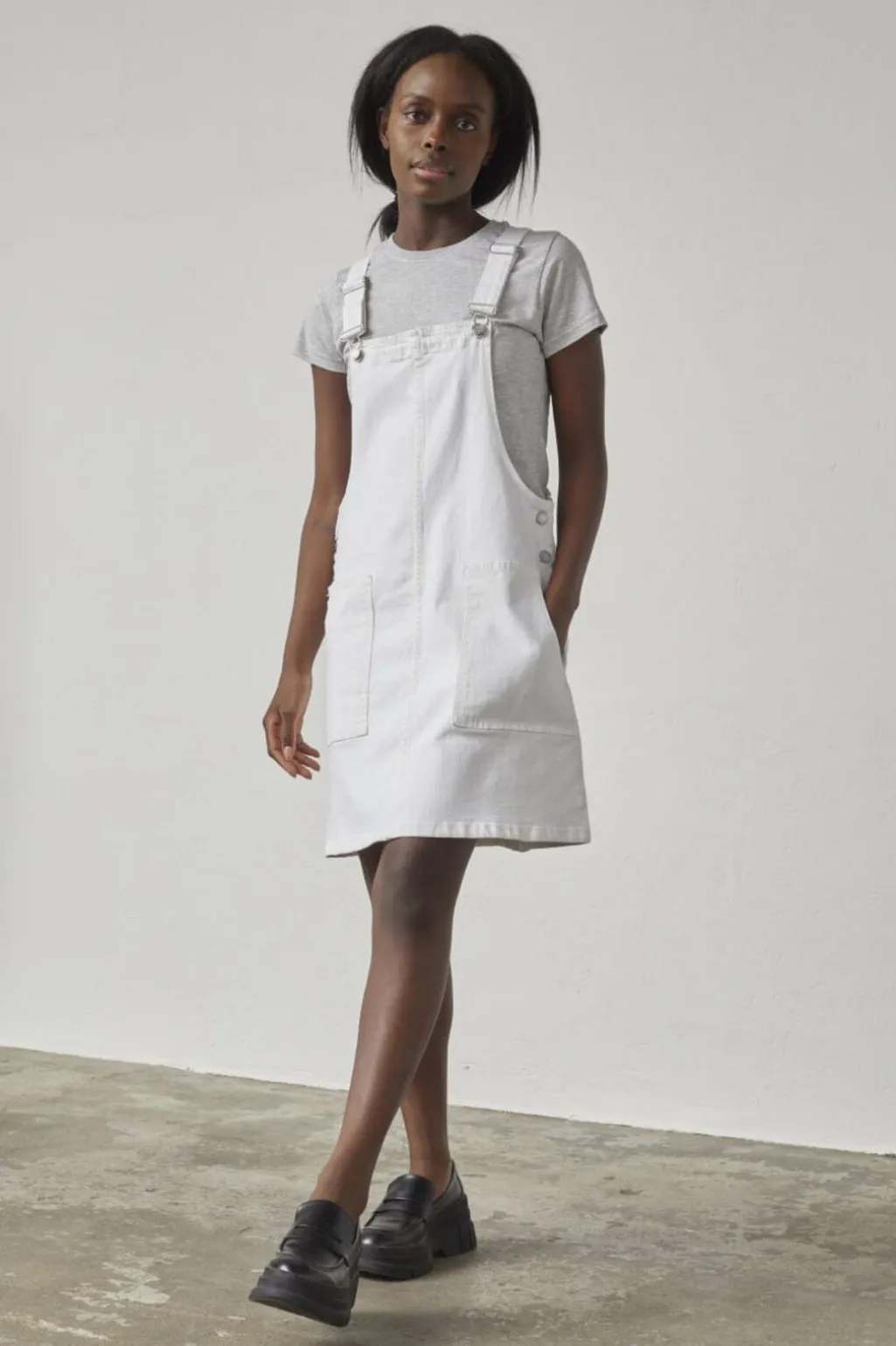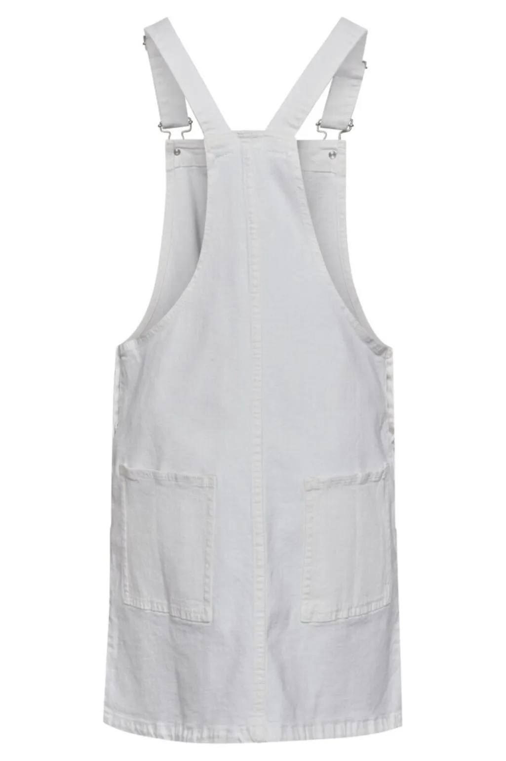Hvid overallkjole fra Sisters Point i denim. Kjolen har frynser i bunden og store lommer foran. De justerbare stropper med metalspænder giver mulighed for at tilpasse pasformen.