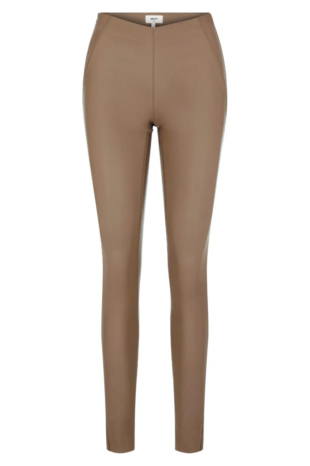 Brune leggings fra Object med en skinnende, coated overflade. Leggingsene har en tætsiddende pasform og lynlås i siden.