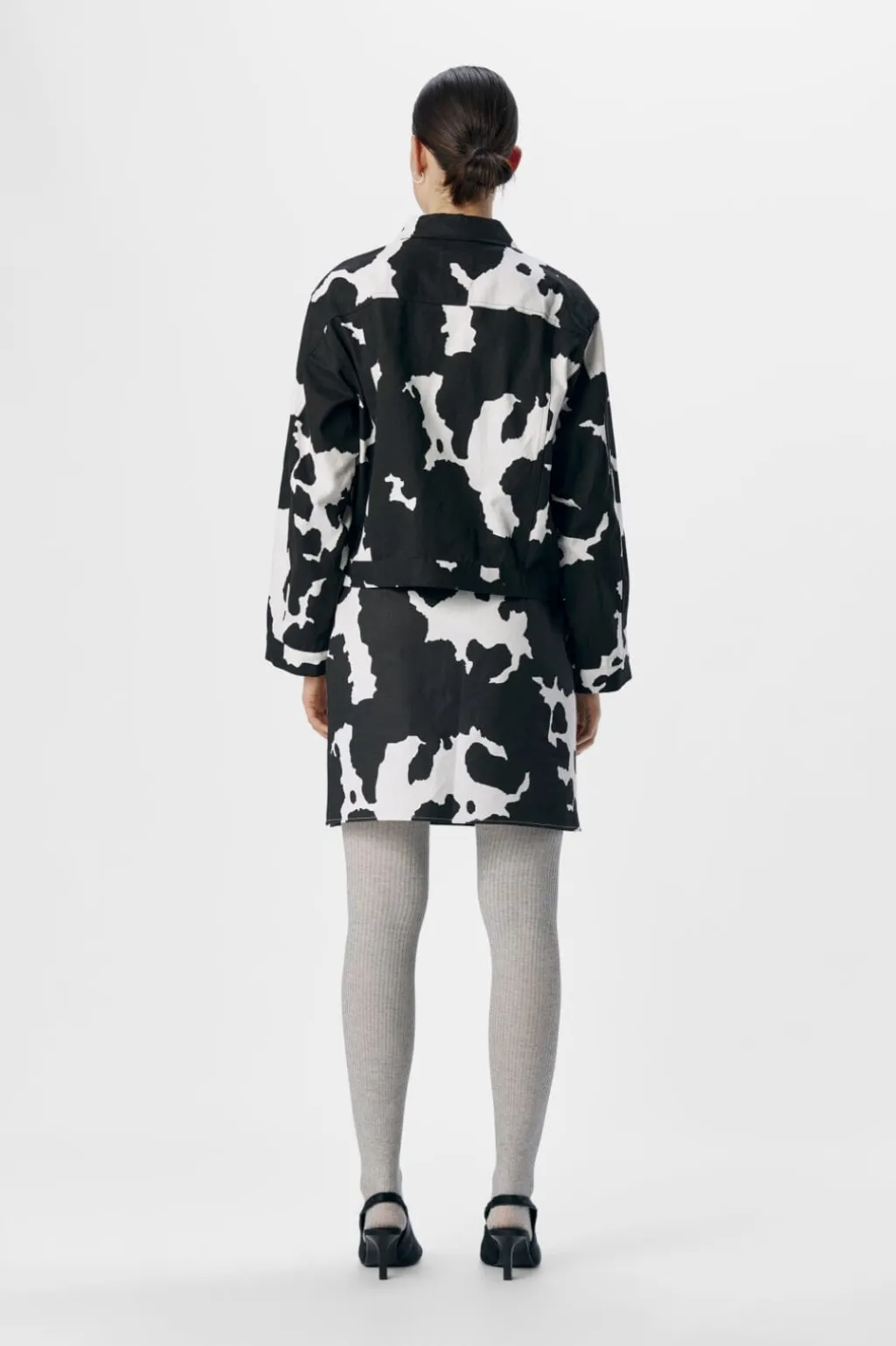 Mini nederdel fra Object med sort og hvidt ko-print over hele overfladen. Nederdelen har en mellemhøj talje og sidder i en regular fit med slids i siden.