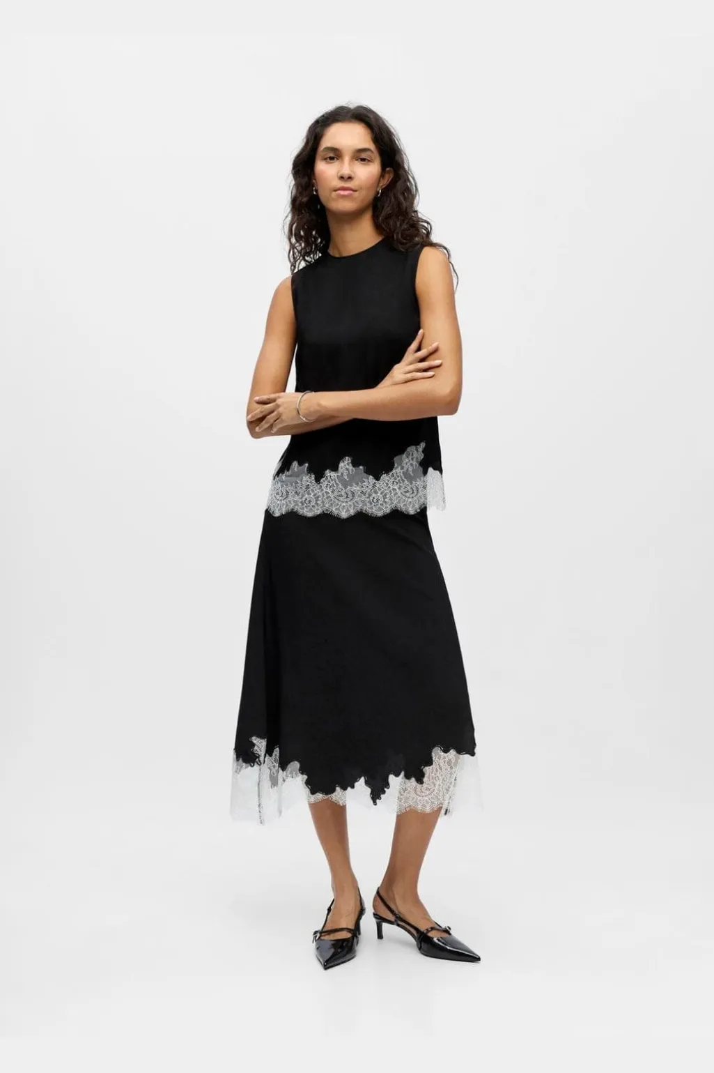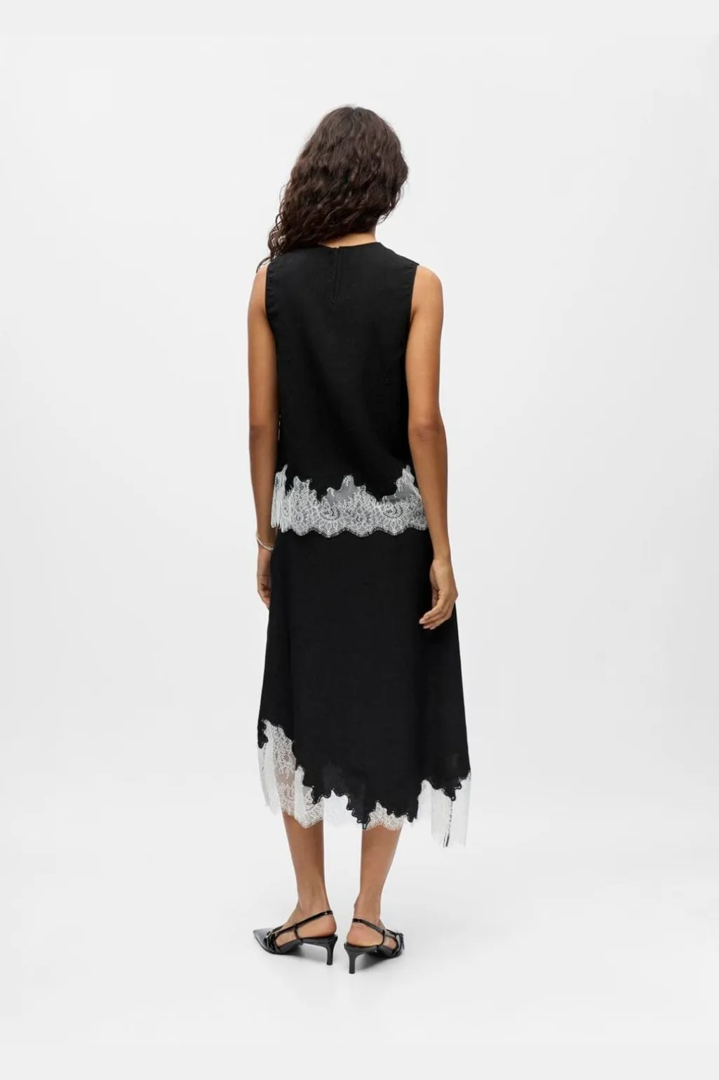 Sort ærmeløs top fra Object med hvide blondekanter. Toppen har en O-hals og lukkes med knapper.