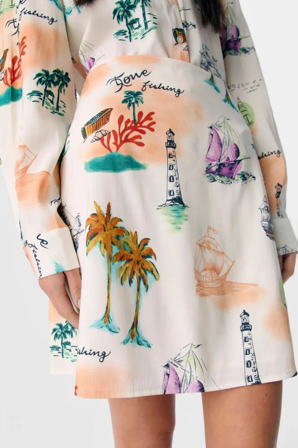 Kort nederdel fra Object med nautisk print på cremehvid bund. Den vævede nederdel har høj talje og skjult lynlås i siden.