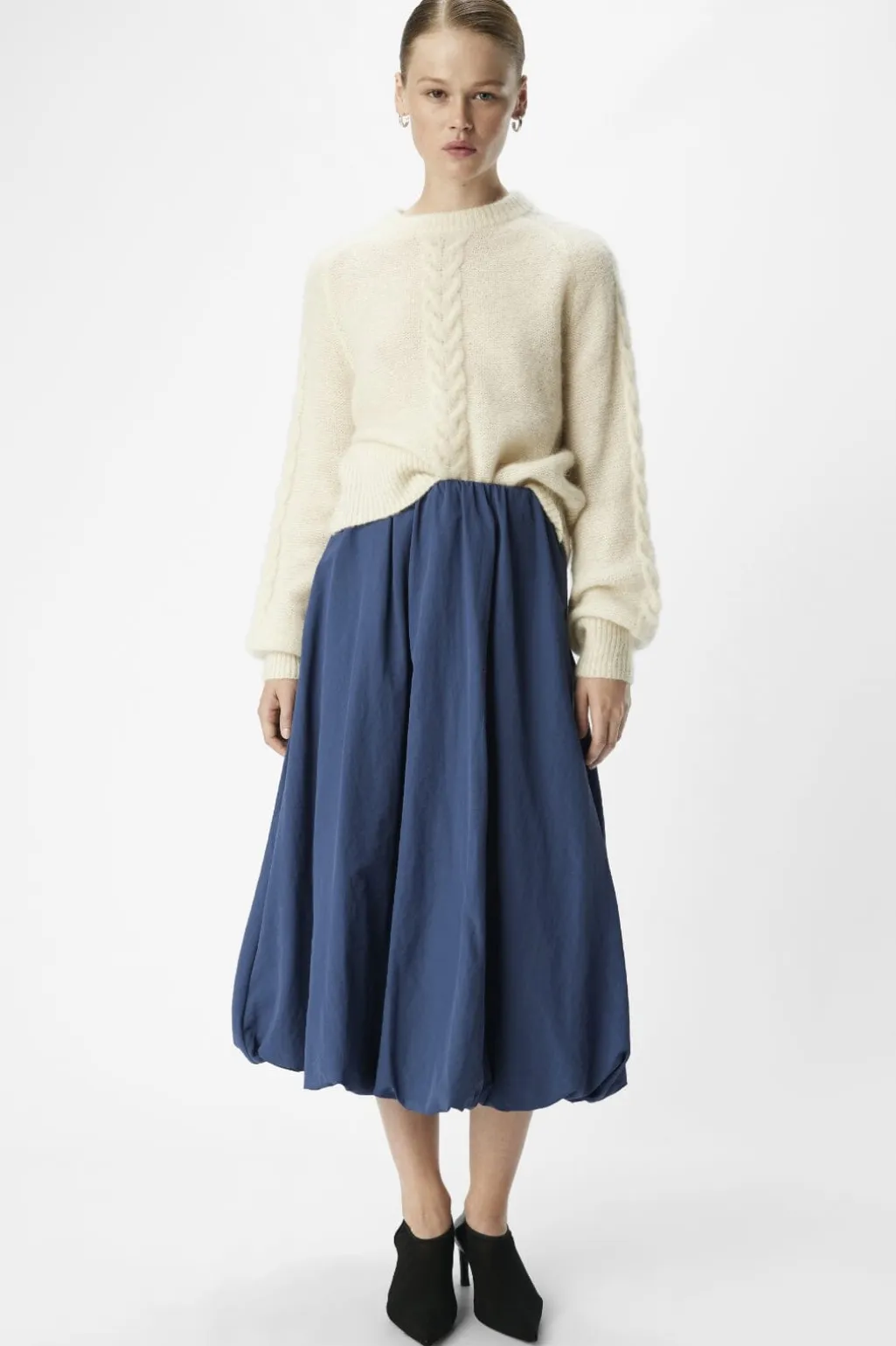 Ballon-nederdel fra Object i mørk denim. Den har en rynket talje og en fyldig silhuet med rynkedetaljer, der skaber en karakteristisk ballonform.