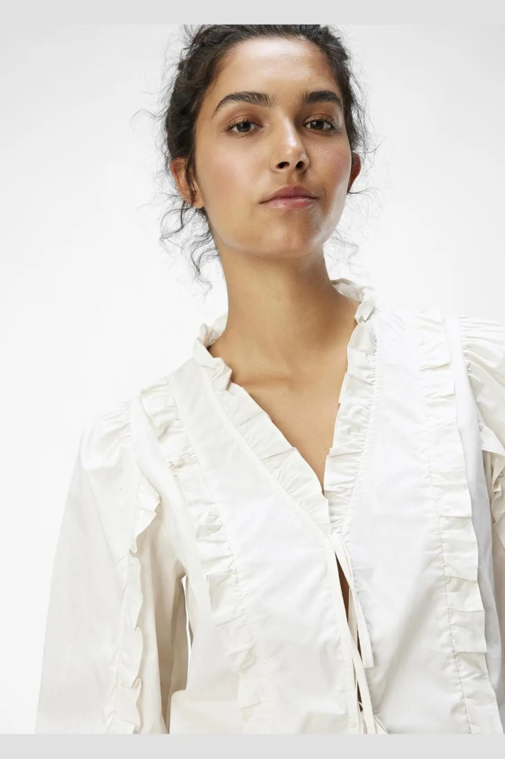Hvid sandfarvet top fra Object med V-halsudskæring og 3/4 ærmer. Toppen har bindebånd i taljen og ruffle-detaljer langs forsiden og ærmerne. Den er syet i et regular fit-design.