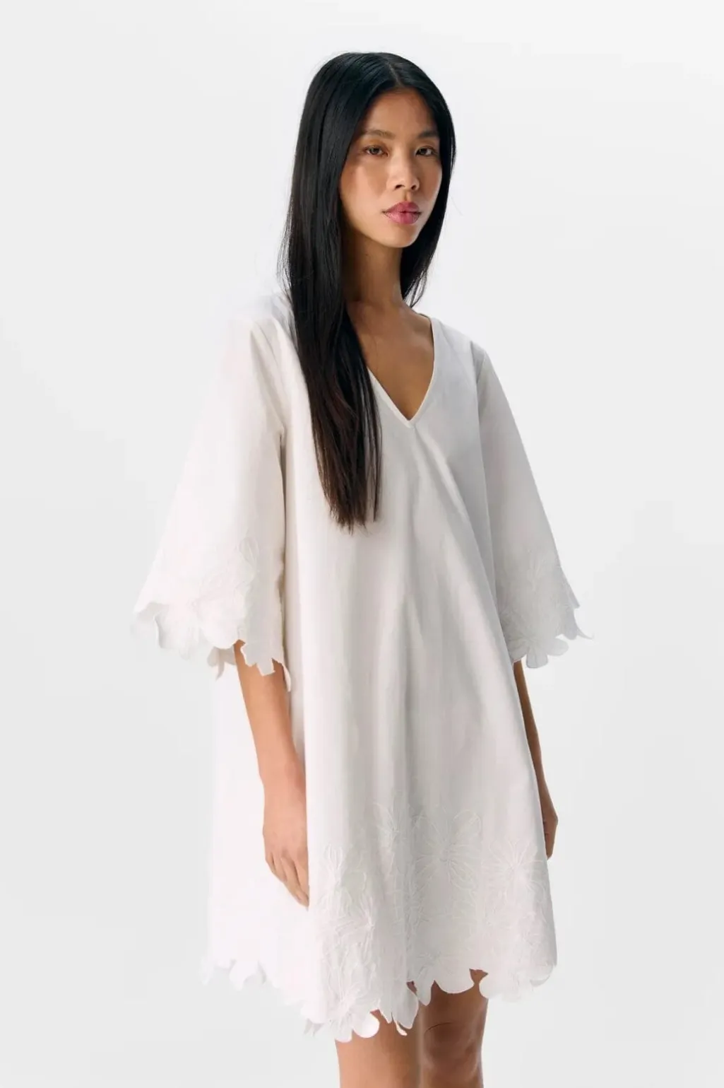 Hvid kort kjole fra Object med v-hals og 3/4 ærmer. Kjolen har en løs pasform og er lavet af vævet materiale med broderede blomsterdetaljer langs kanten.