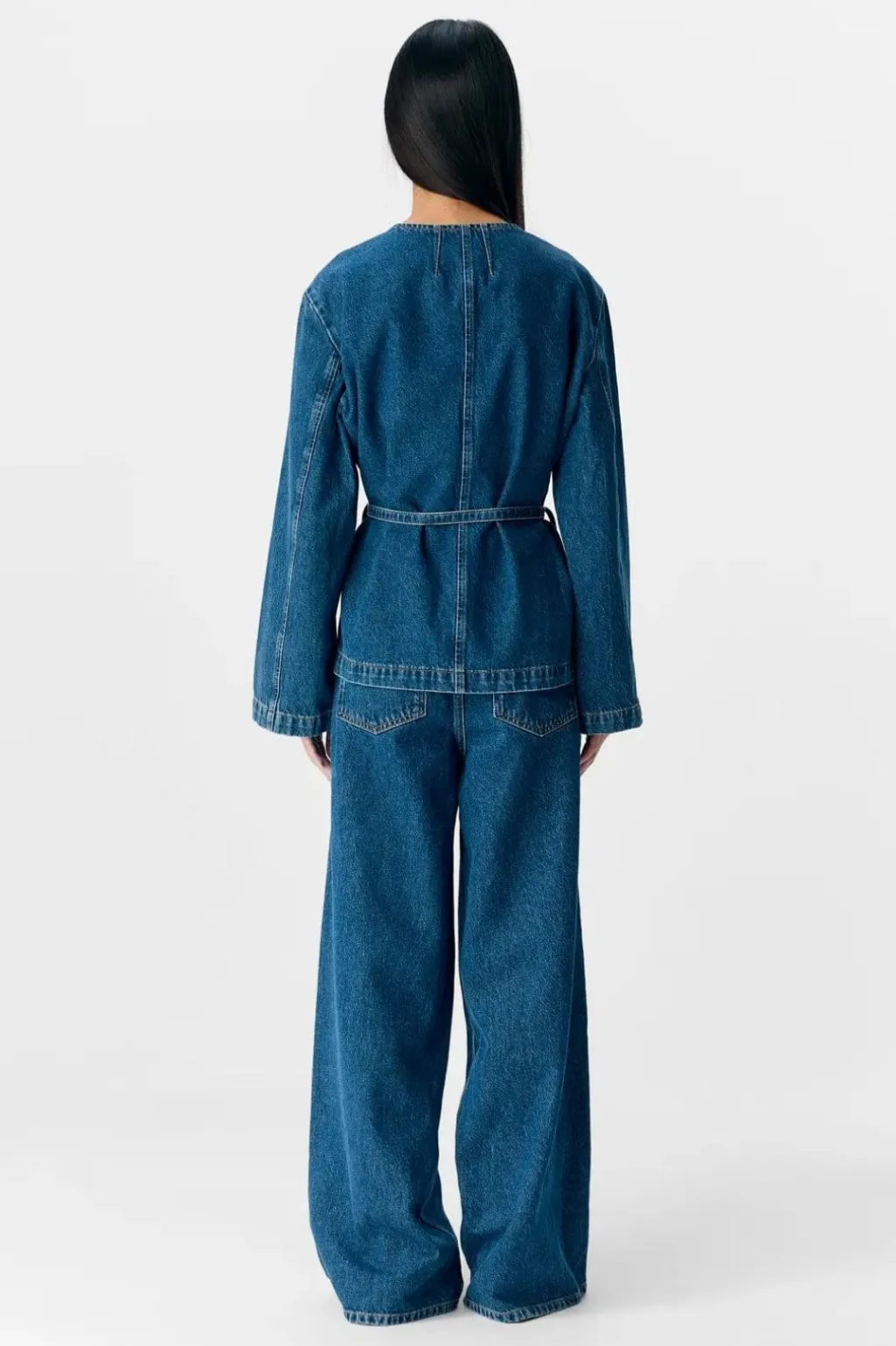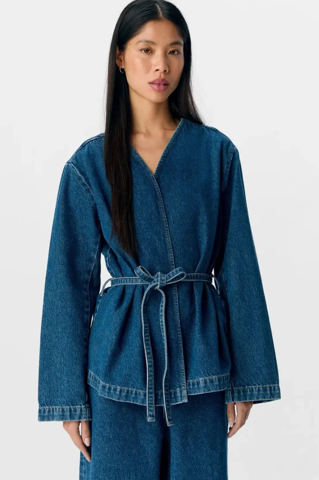 Denimblazer fra Object med omslagsdesign og bindebånd i taljen. Blazeren har en løs pasform med V-halsudskæring og brede ærmer i mediumblå denim.