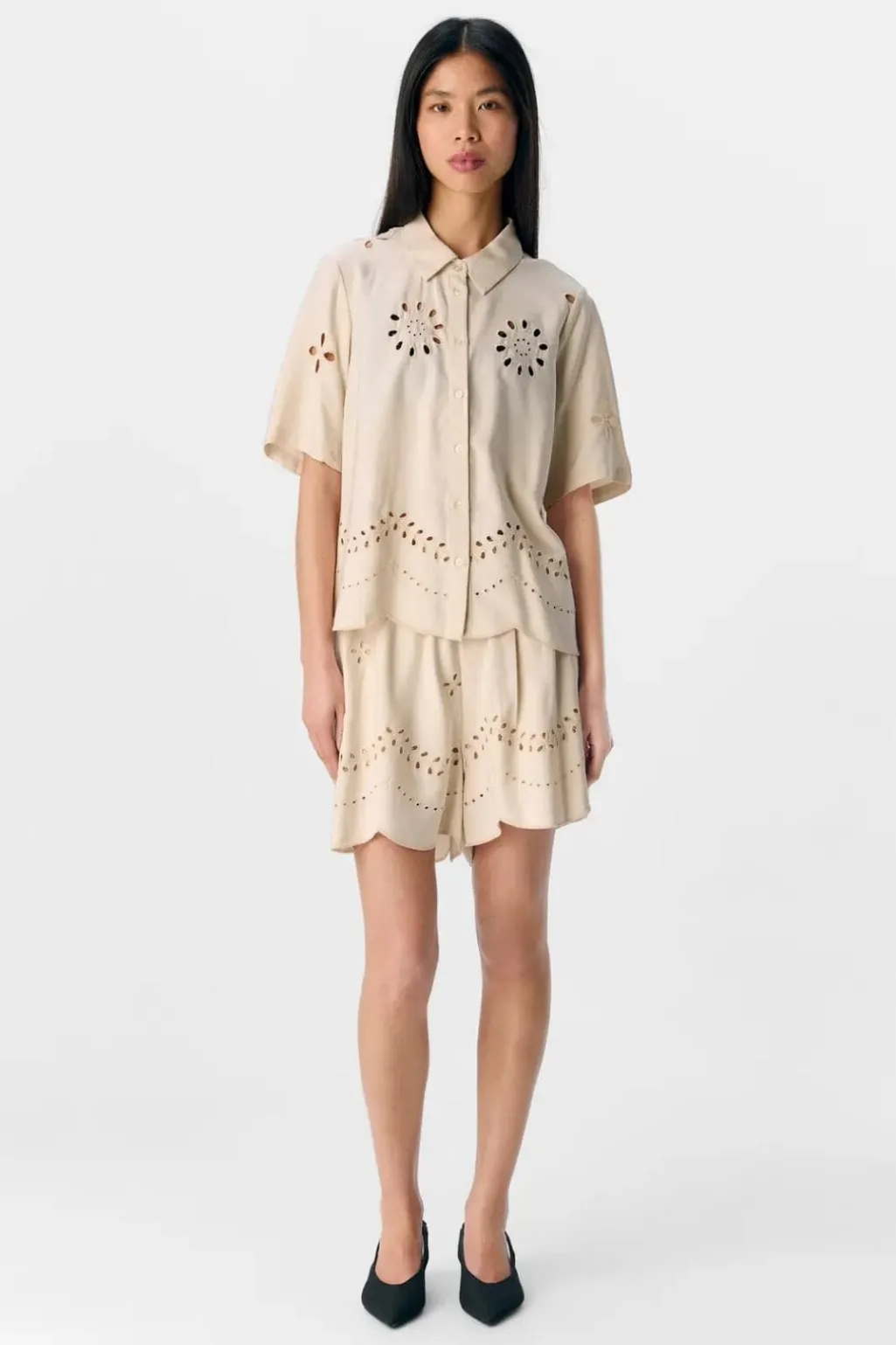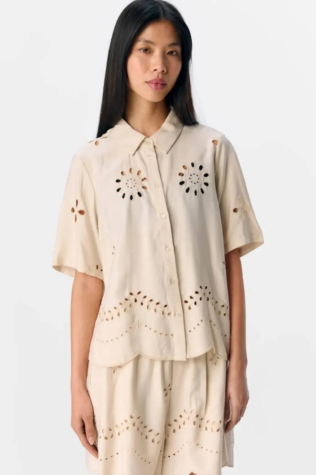 Kortærmet skjorte fra Object i sandfarvet nuance. Skjorten har udskårne blomstermønstre og broderi på forsiden samt en klassisk V-hals og knaplukning.