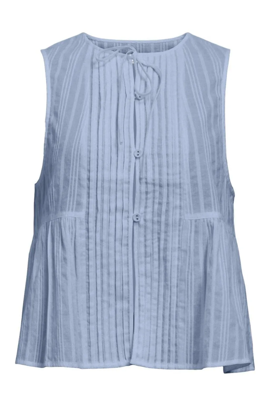 Ærmeløs top fra Object i en lys blå nuance med lodrette striber. Toppen har en rund halsudskæring med snøredetalje og knaplukning foran. Den feminine silhuet kombinerer praktiske detaljer med et let design.