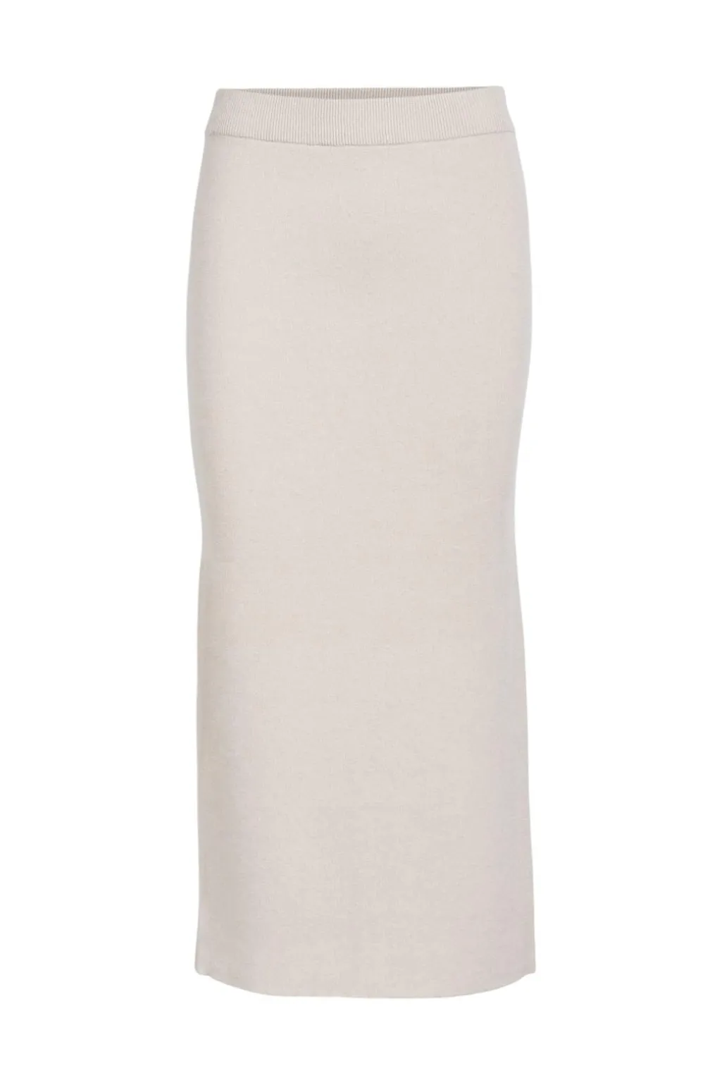 Strikket nederdel fra Object i lysegrå. Den har en høj talje og går ned til anklerne. Strikken med garnløkker giver en behagelig stræk-effekt.