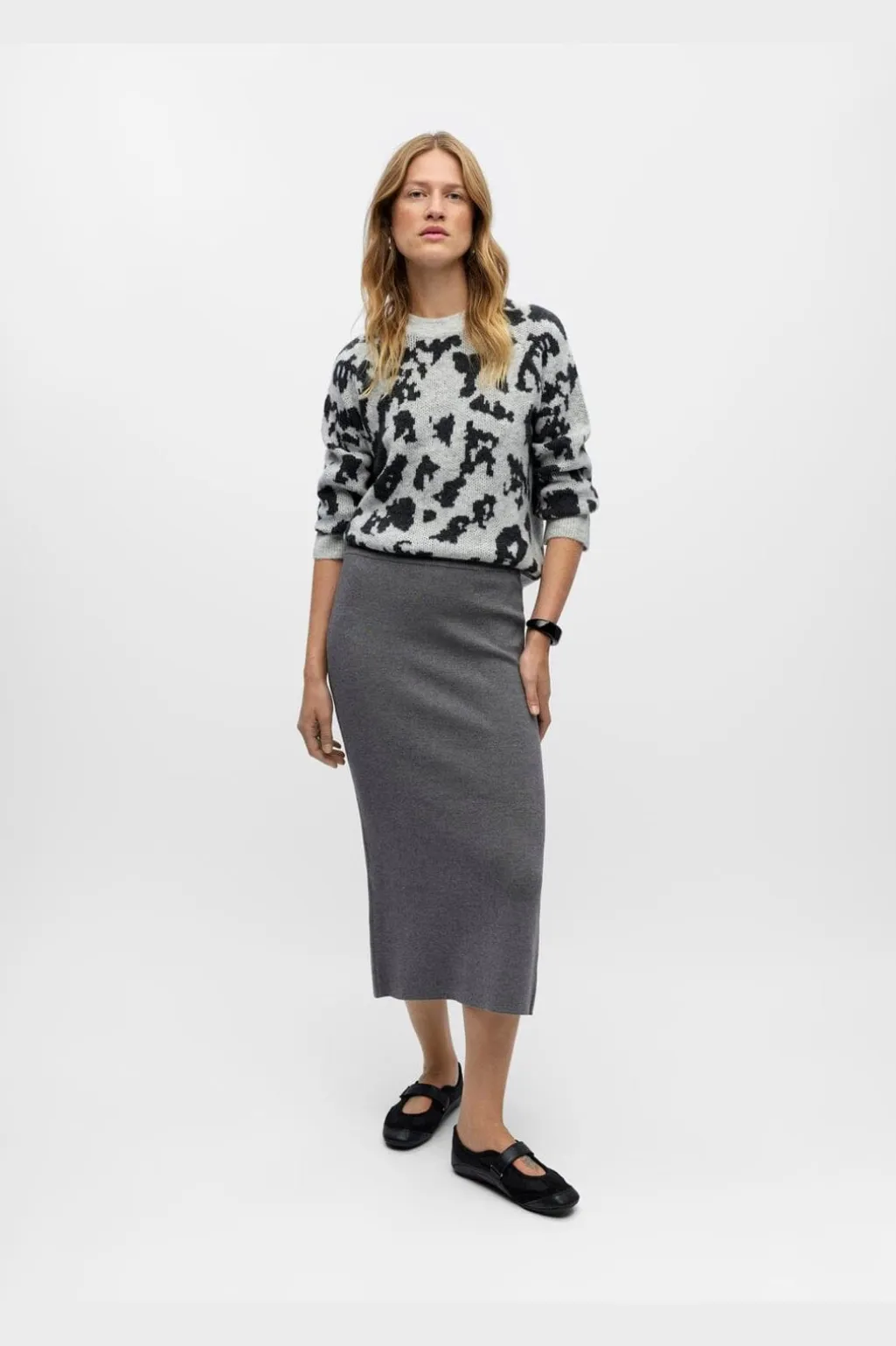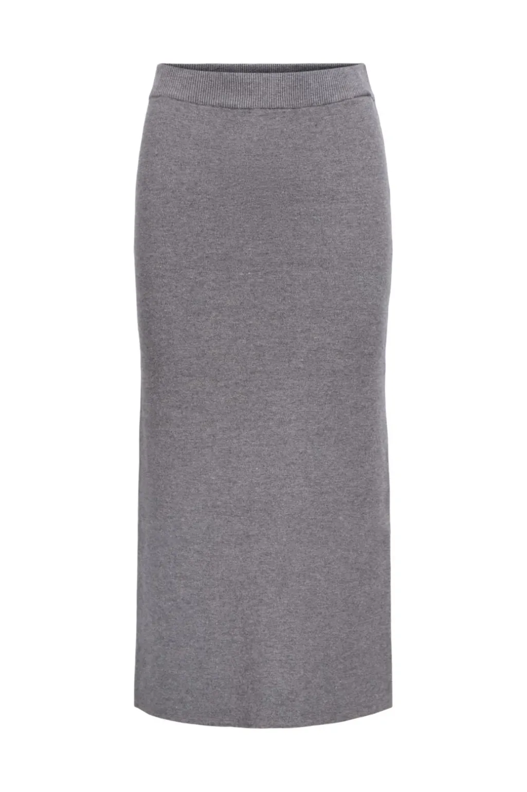 Grå strikket nederdel fra Object med tætsiddende pasform og læg til læggen. Den er lavet i en blød strikket kvalitet med elastisk linning og lille slids bagpå.