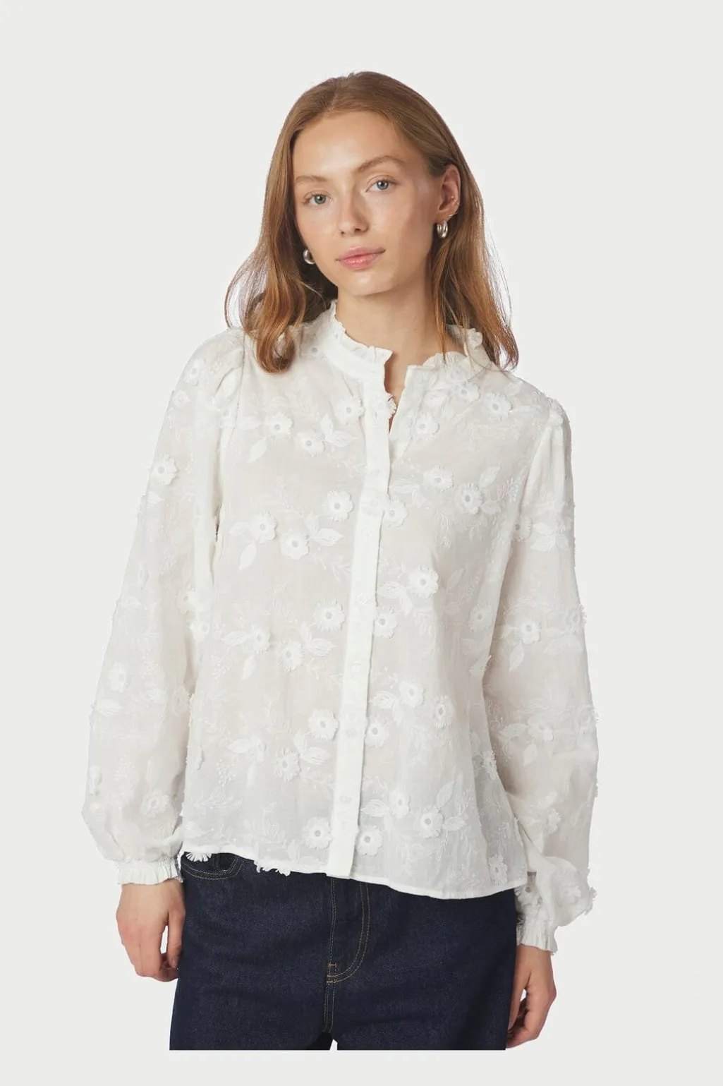 Hvid skjorte fra Neo Noir med broderet blomstermønster over hele skjorten. Skjorten har en høj hals med flæsekant og lange ærmer med elastiske manchetter.