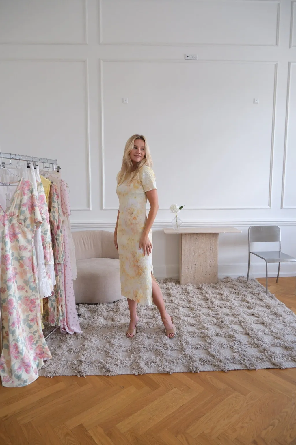 Plisseret midi-kjole i hvid med gult print. Kjolen har en rund halsudskæring, korte ærmer med flæsedetaljer og en slids i begge sider nederst på kjolen. Længde (målt fra skulder til søm): ca. 124 cm i størrelse S. Normal i størrelsen.