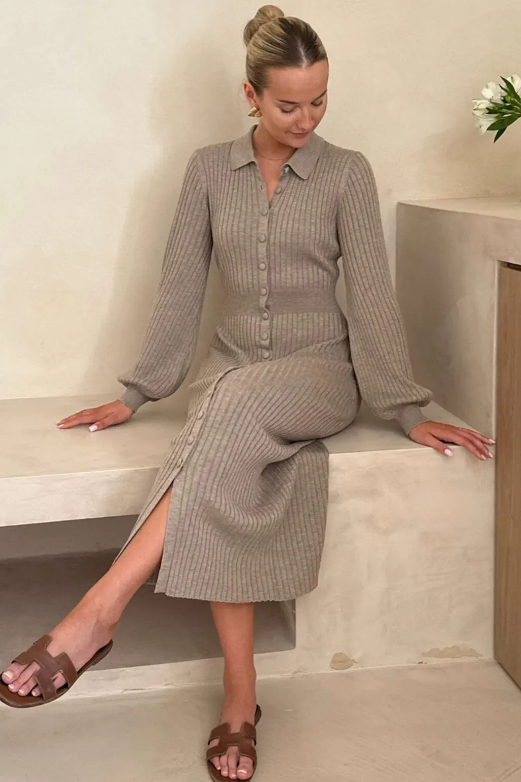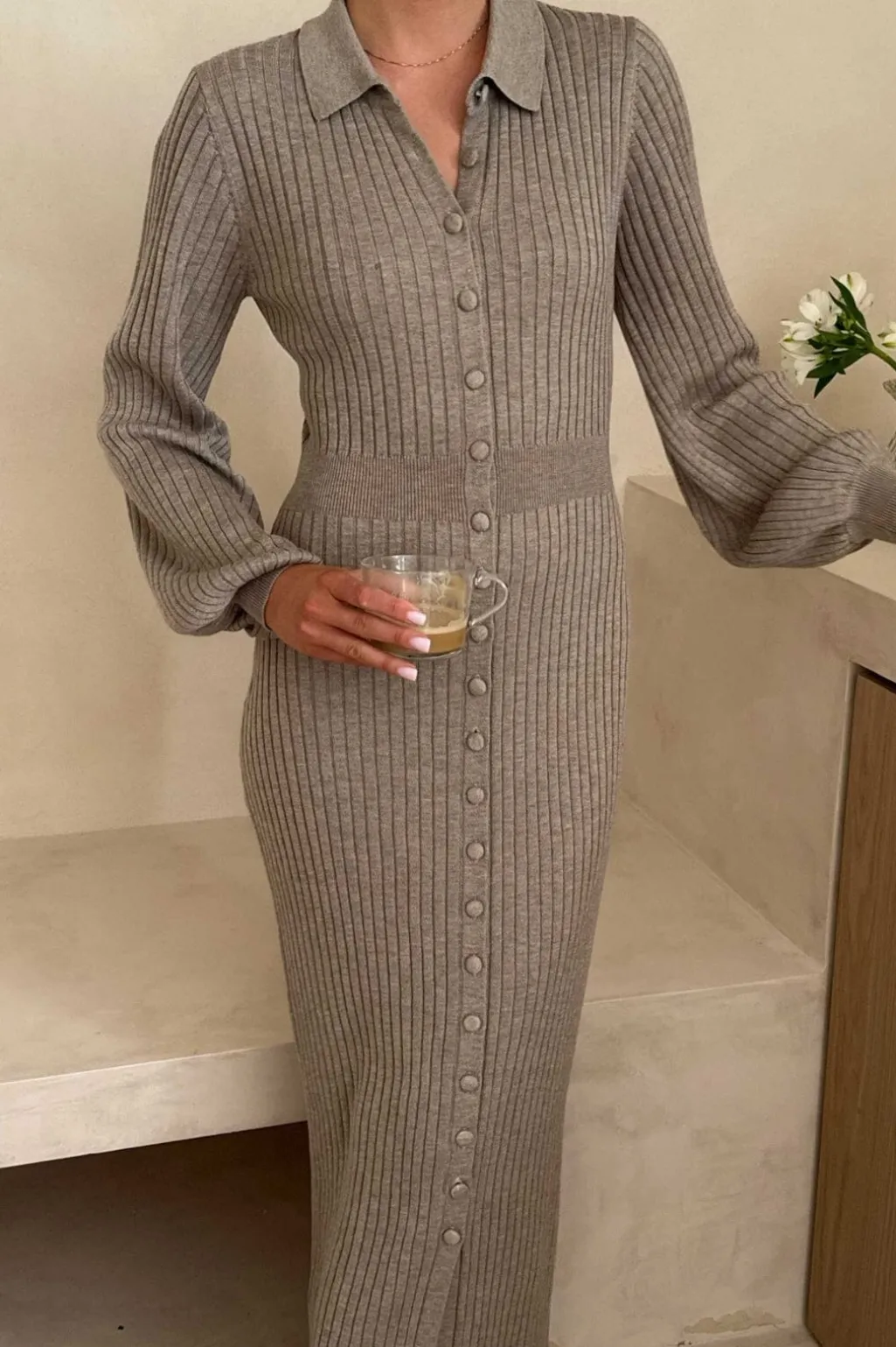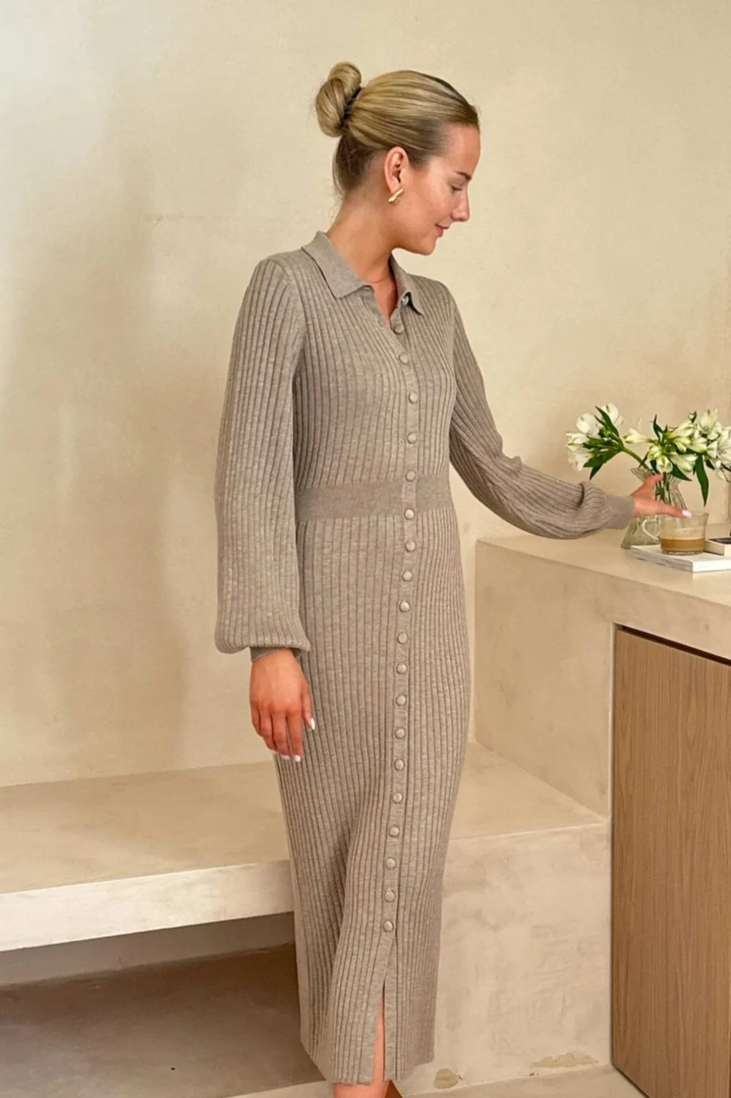 Lang kjole fra BYIC i lys brun med ribstrikket struktur. Kjolen har skjortekrave, knaplukning hele vejen ned og ballonærmer med stram kant ved håndleddet.
