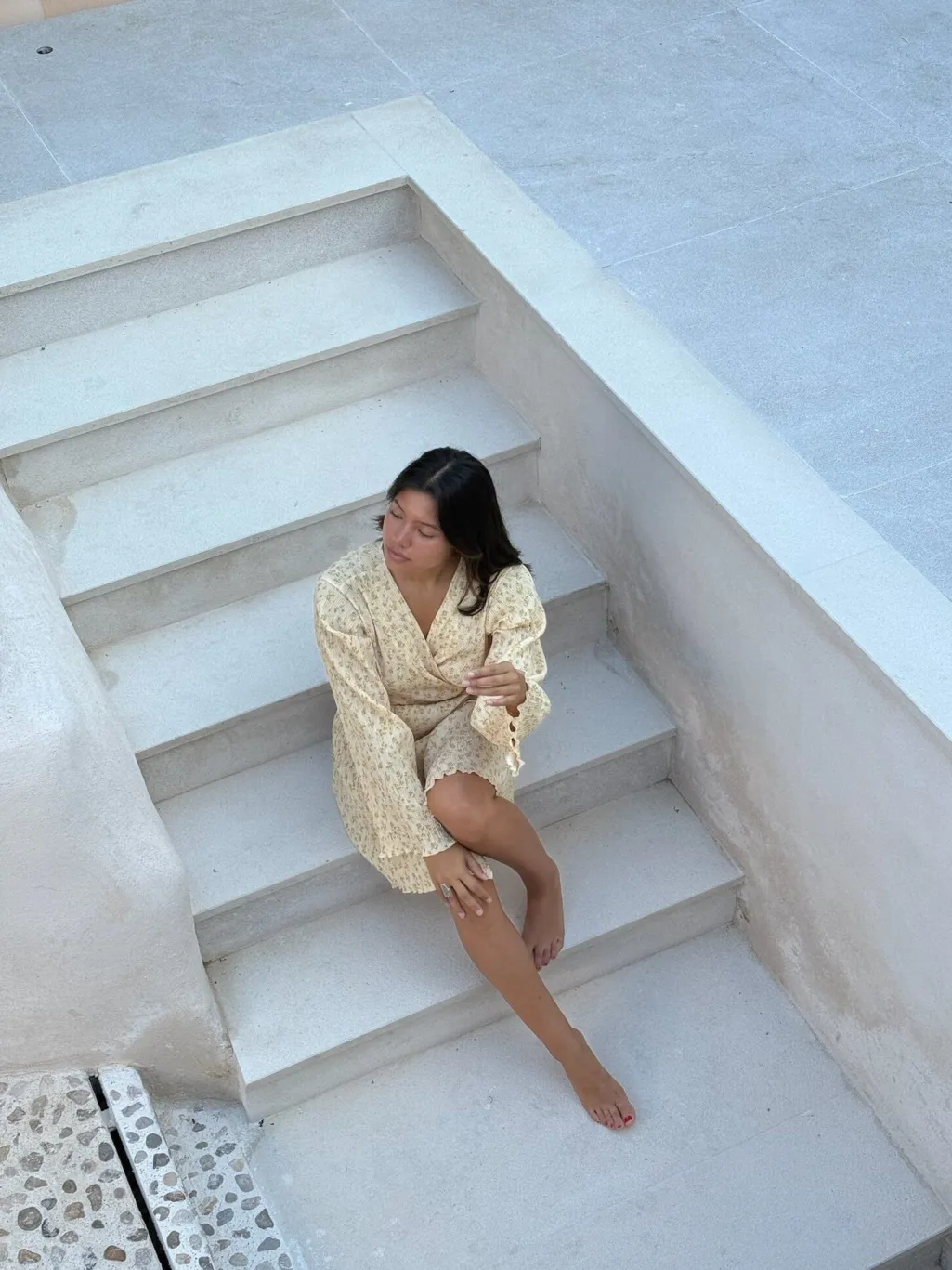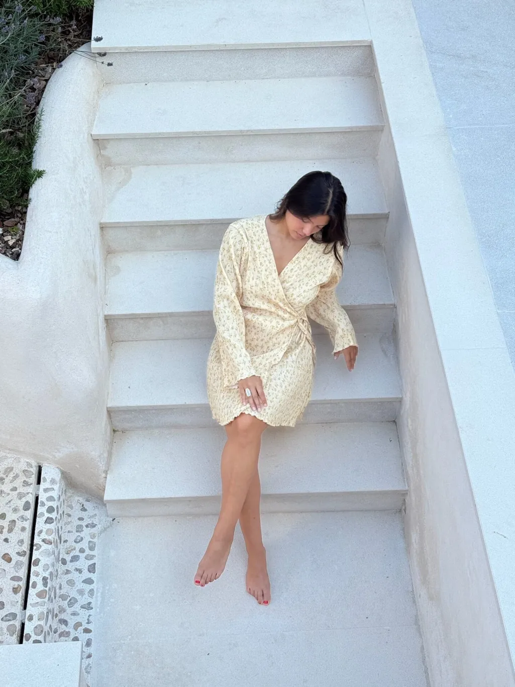 Smuk wrap-kjole. Kjolen har brede, lange ærmer og en bindelukning i taljen. Den har en V-udskæring og fine flæsedetaljer langs kanterne. Vi anbefaler at bruge en neutral underkjole under. Stor i størrelsen – vi anbefaler, at du går en størrelse ned.