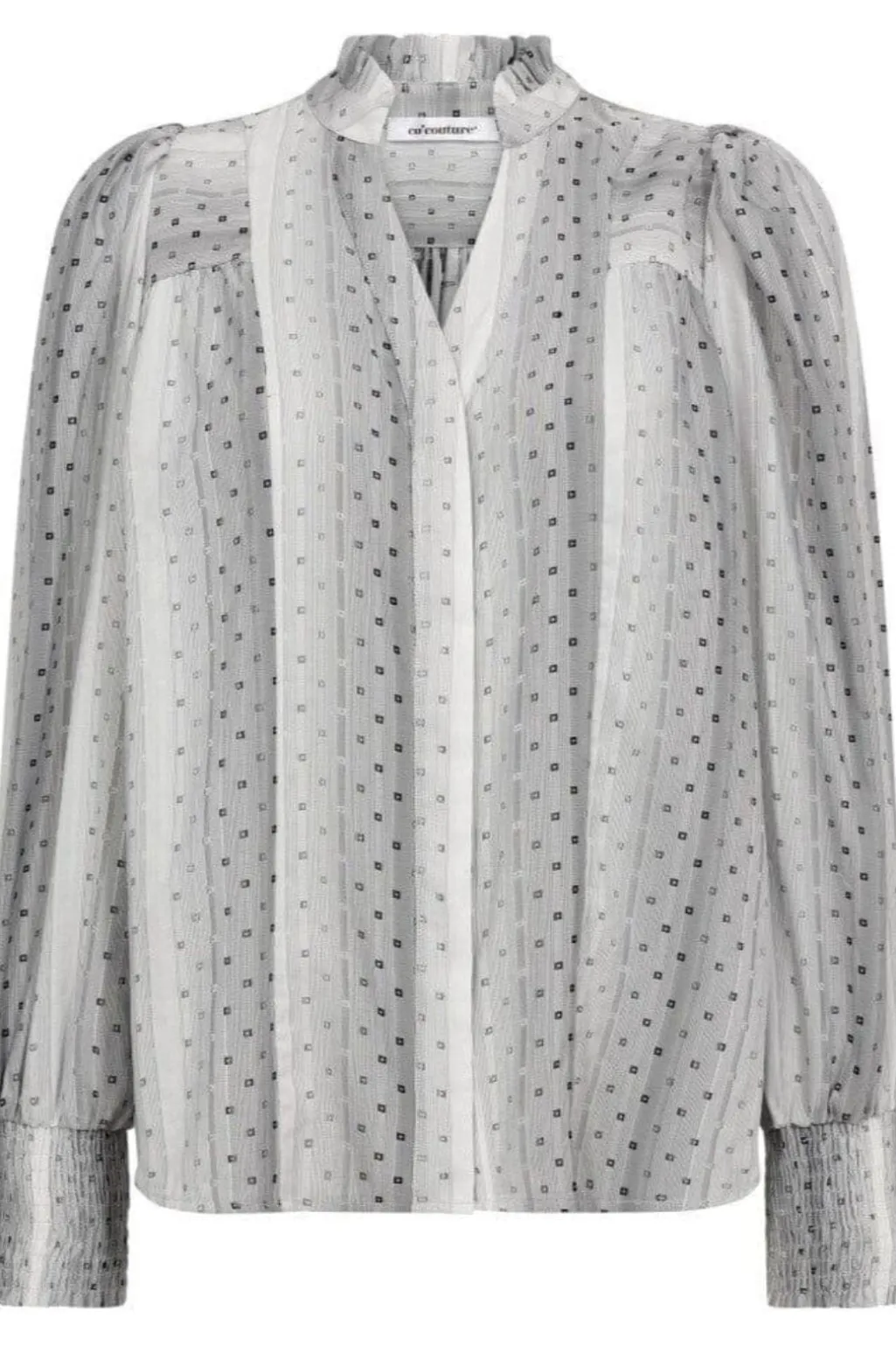 Off-white skjorte fra Co´Couture med et prikket mønster og lodrette striber. Blusen har en V-hals med rynket krave og lange ærmer med samlede manchetter.