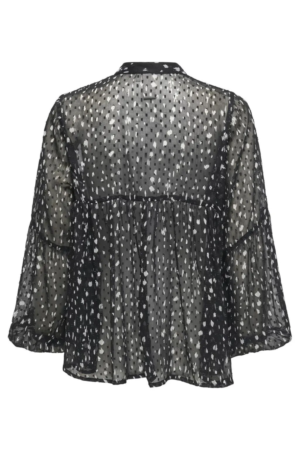 Sort top fra Only med uregelmæssigt hvidt prikmønster. Toppen har en løs pasform med V-halsudskæring og lange ærmer. Stoffet er gennemsigtigt.
