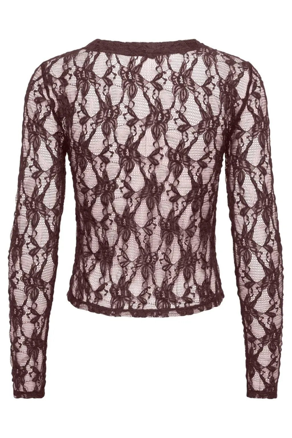 Langærmet top fra Only i gennemsigtigt blondemateriale med V-hals. Toppen er mørkebrun og har dekorative knapper med perledetaljer.