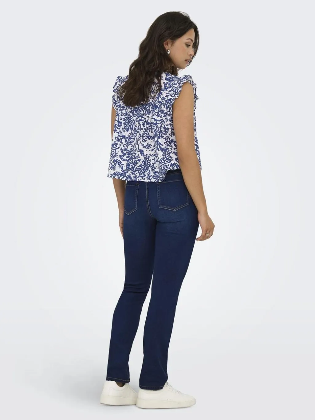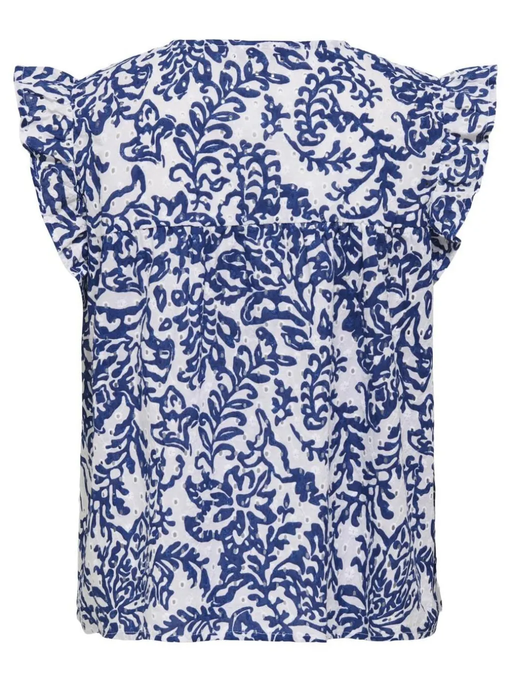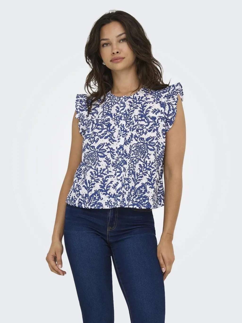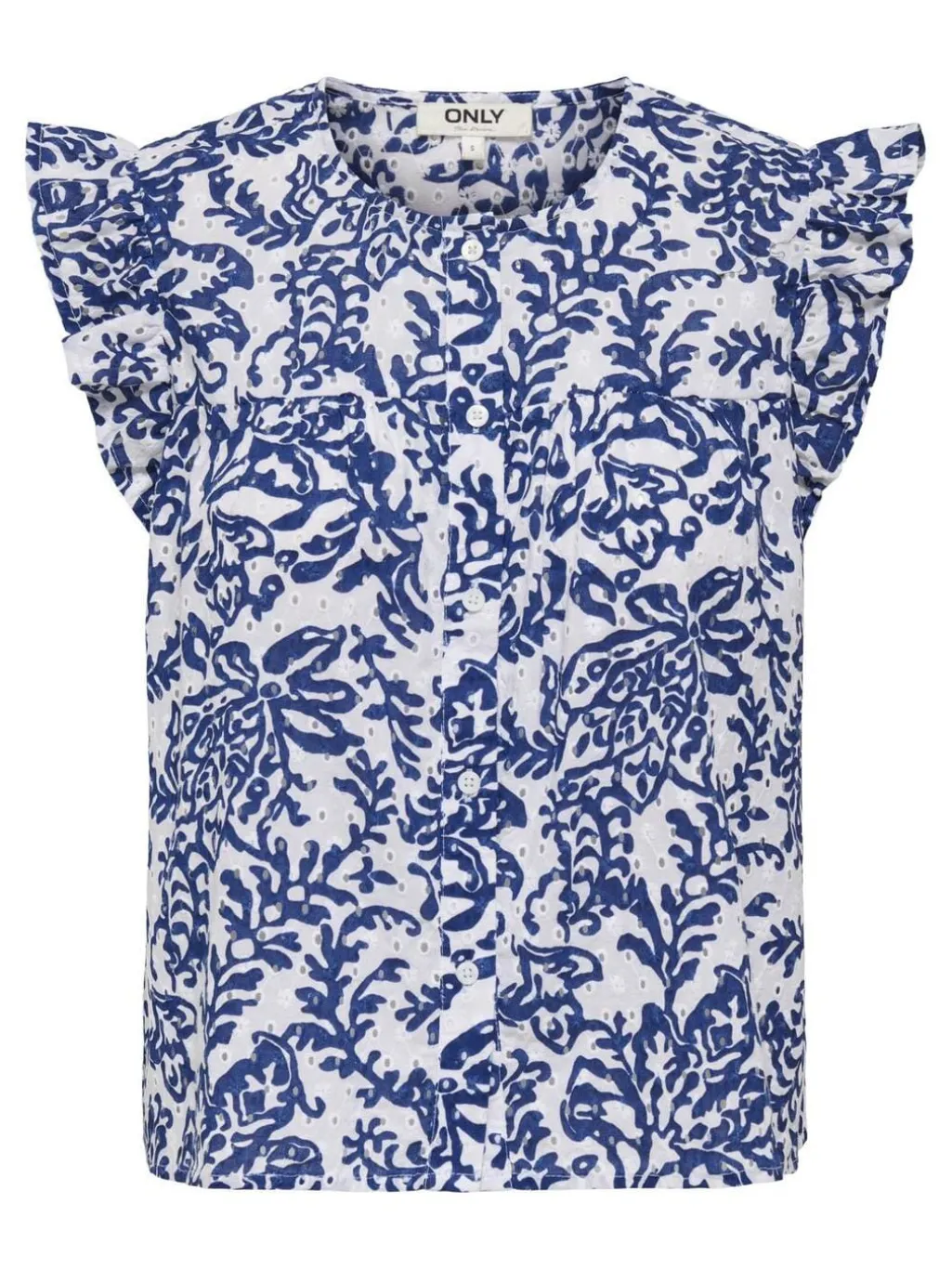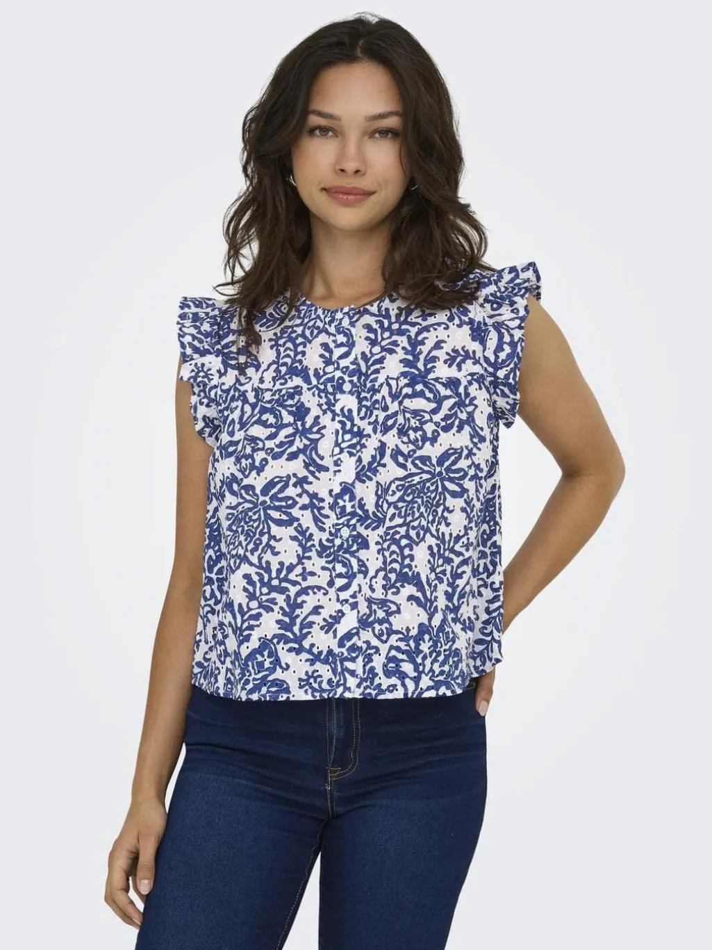 Hvid bomuldstop fra Only med blåt blomstermønster. Toppen har flæseærmer og knaplukning foran. Den runde halsudskæring og regular fit gør den nem at style.