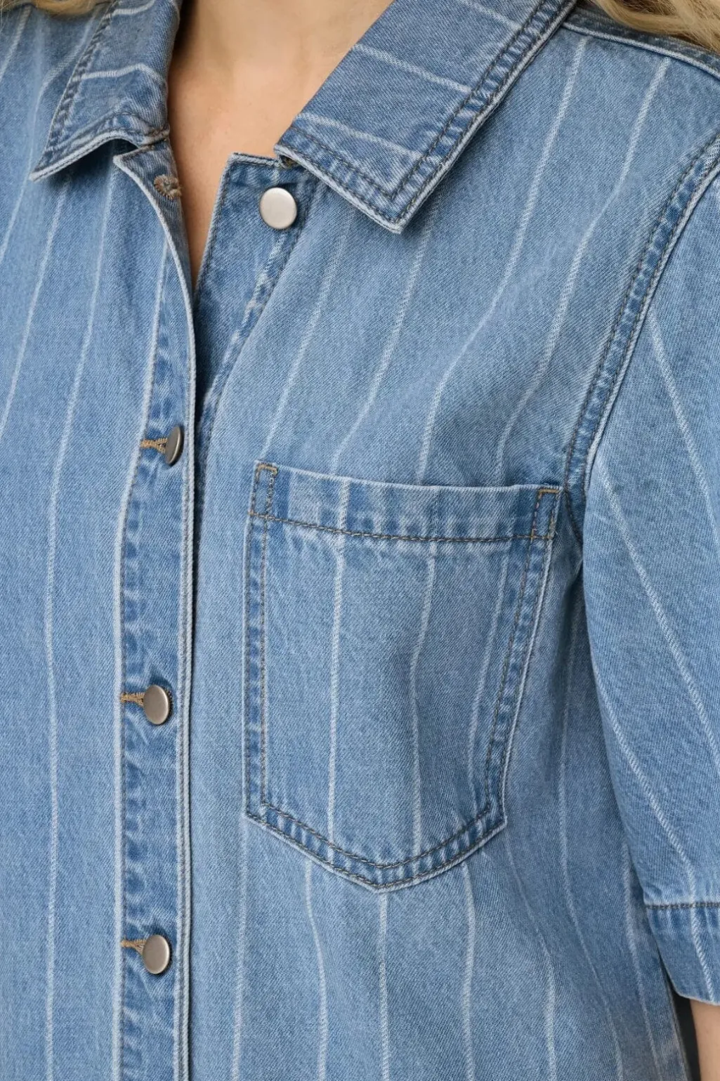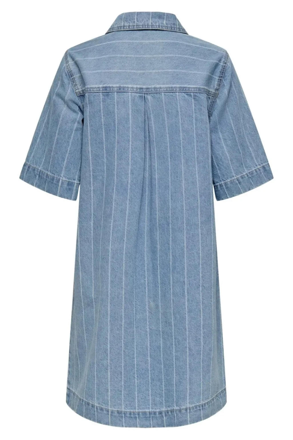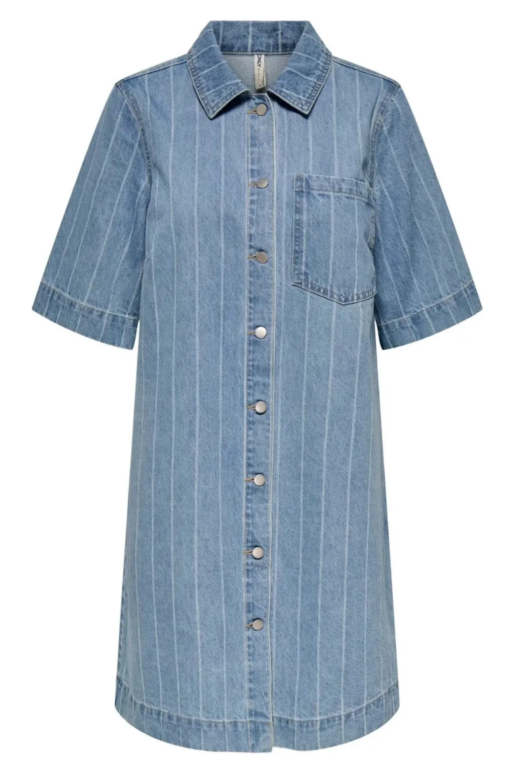 Lyseblå denimkjole fra Only med striber og skjortekrave. Kjolen har korte, boxy ærmer og en praktisk brystlomme. Metalknapper pryder forsiden fra kraven til kanten.