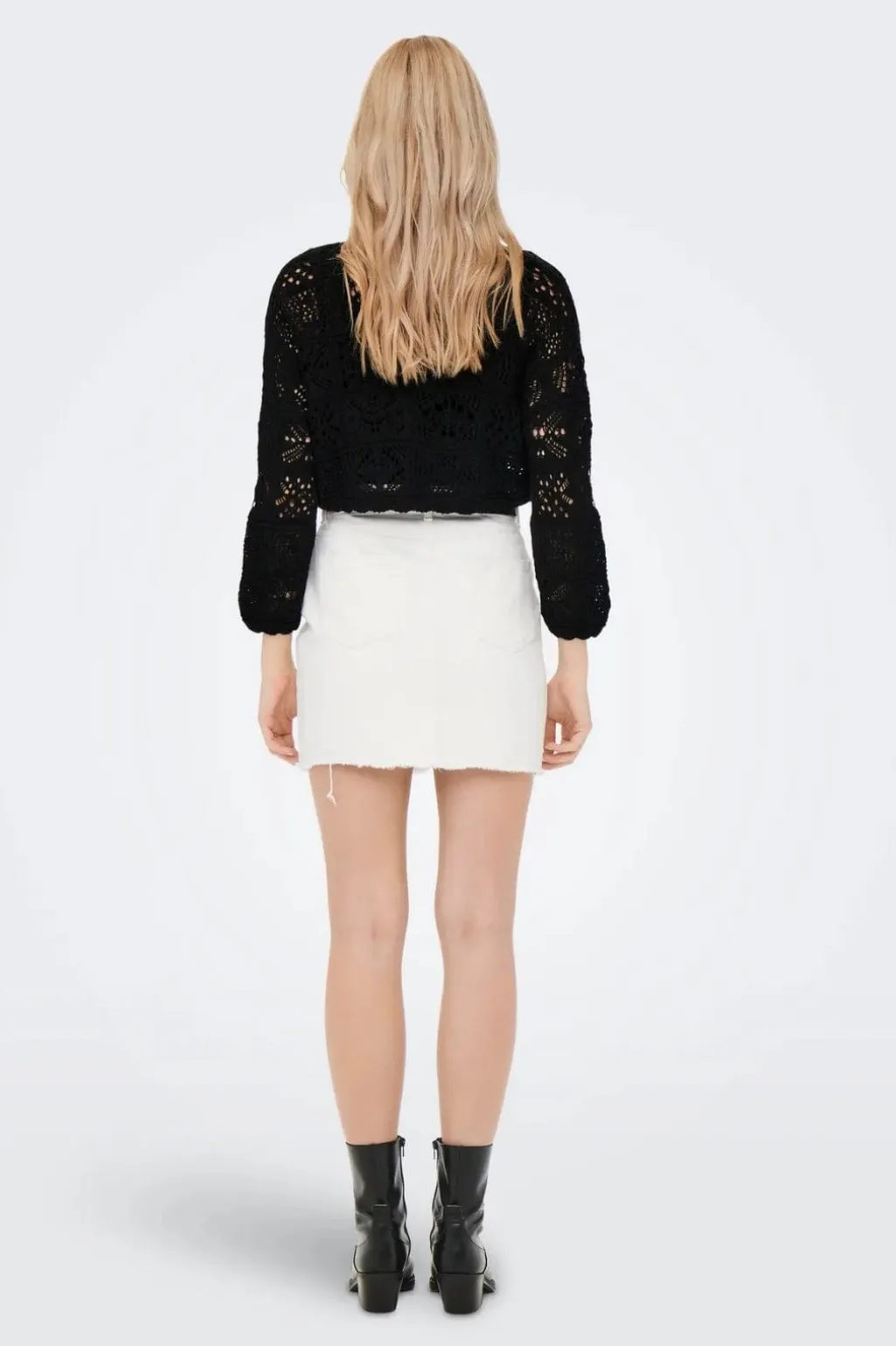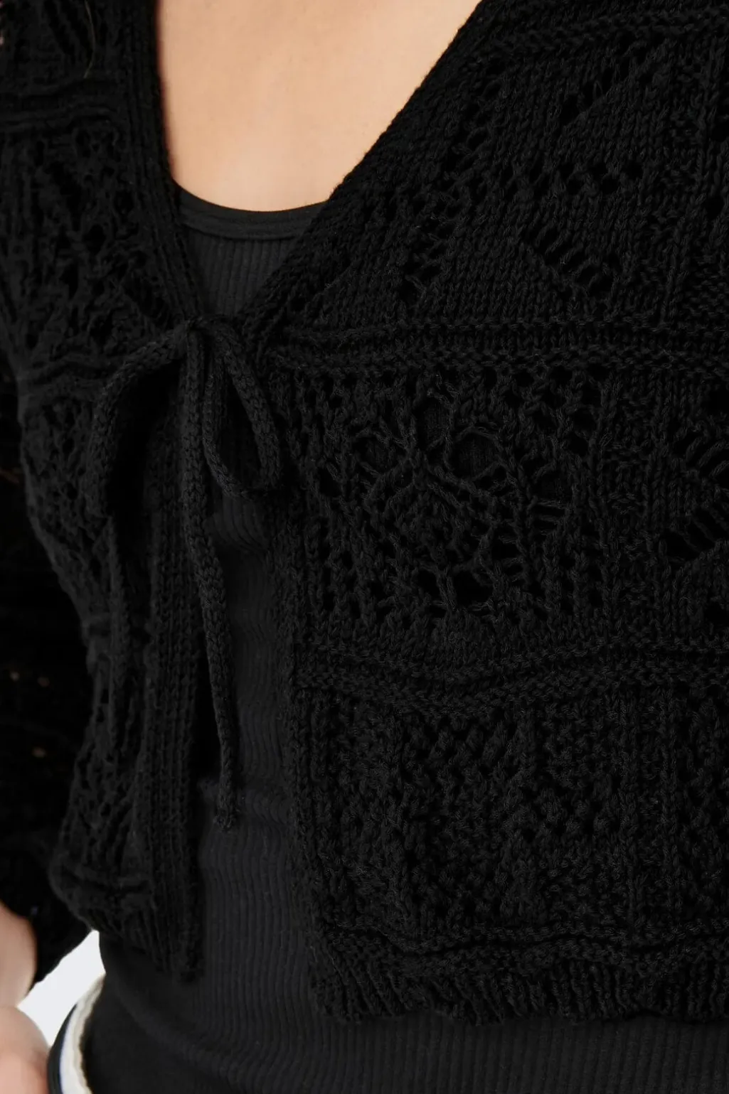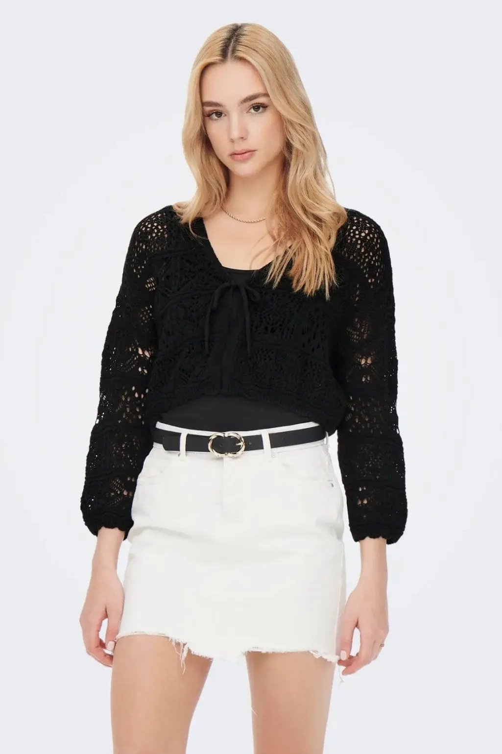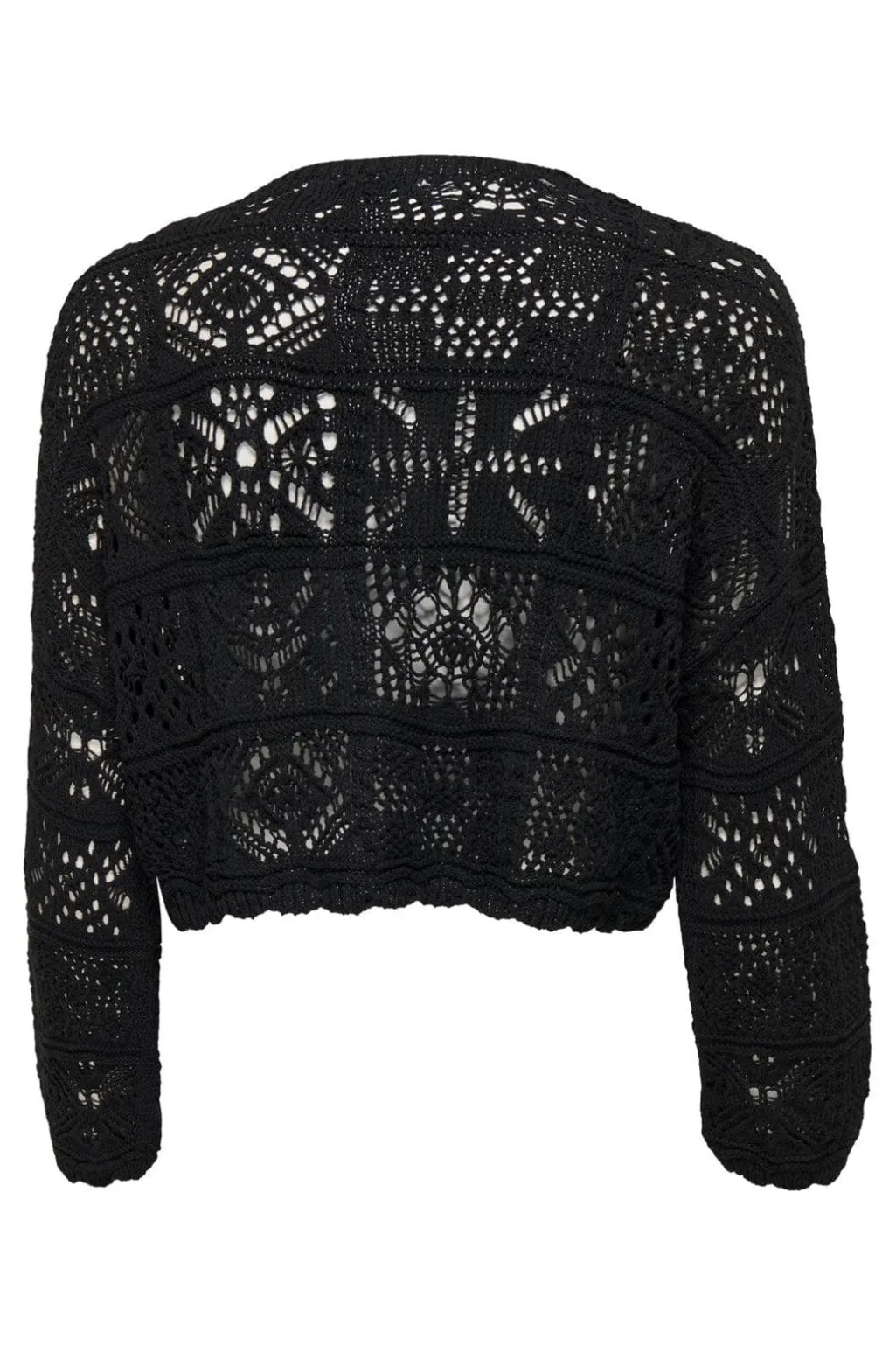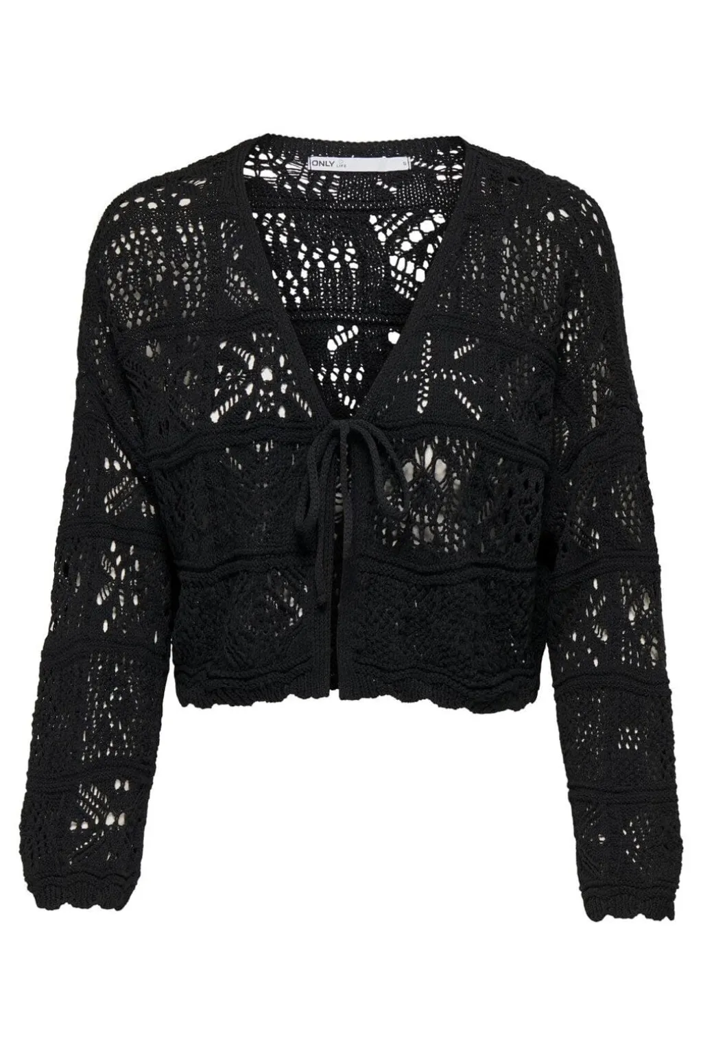Sort cardigan fra Only med hæklet mønster og muslingedetaljer. Cardiganen har en kort model med V-halsudskæring og bindebånd foran.