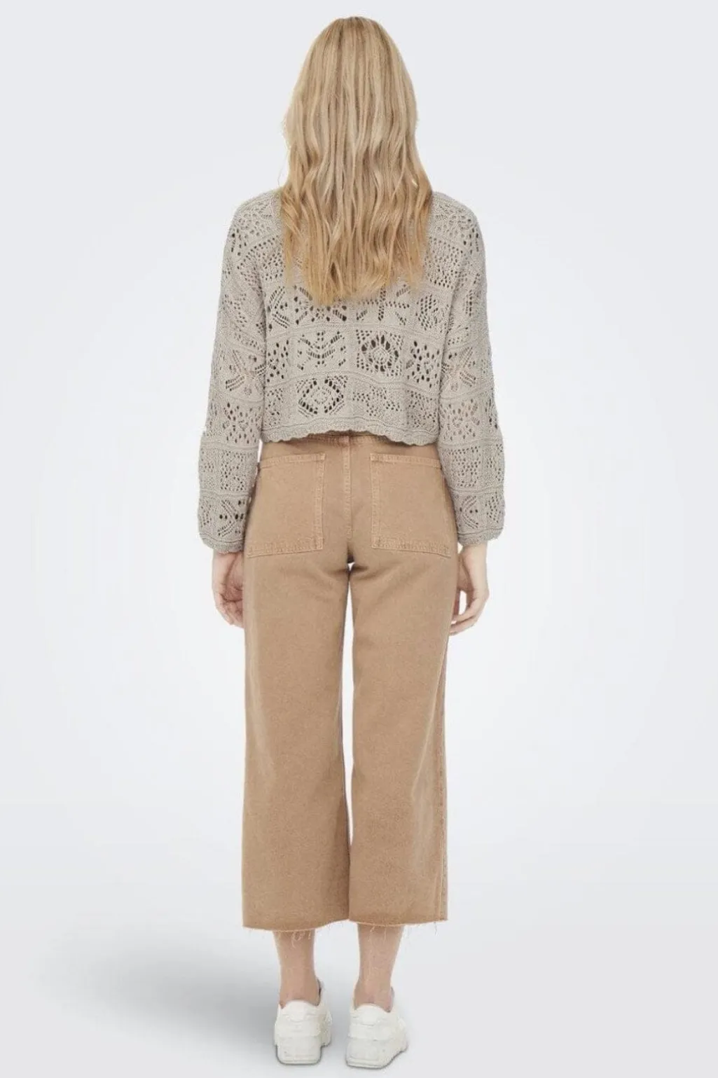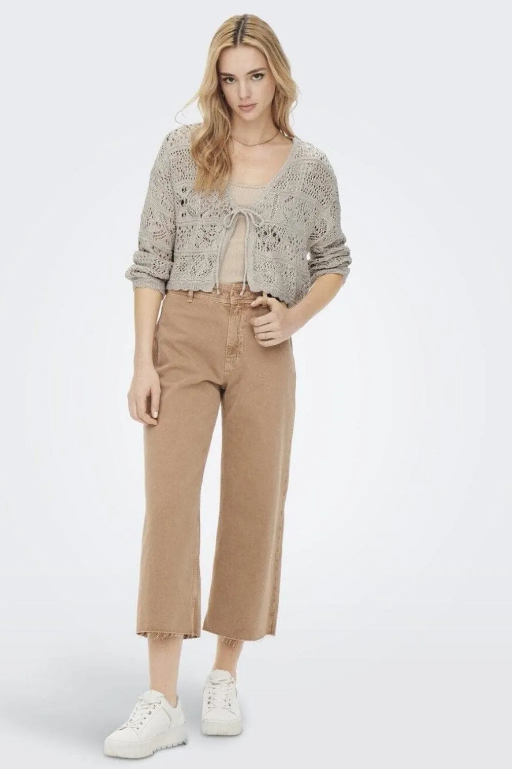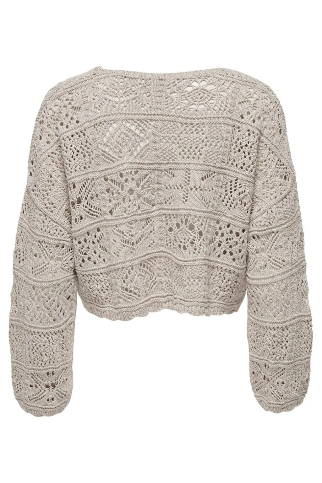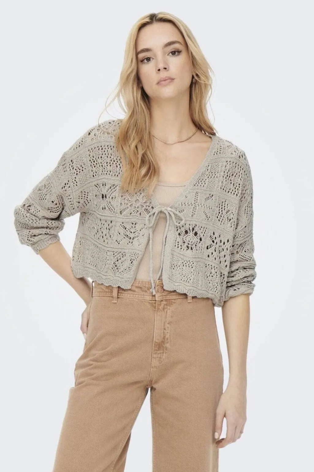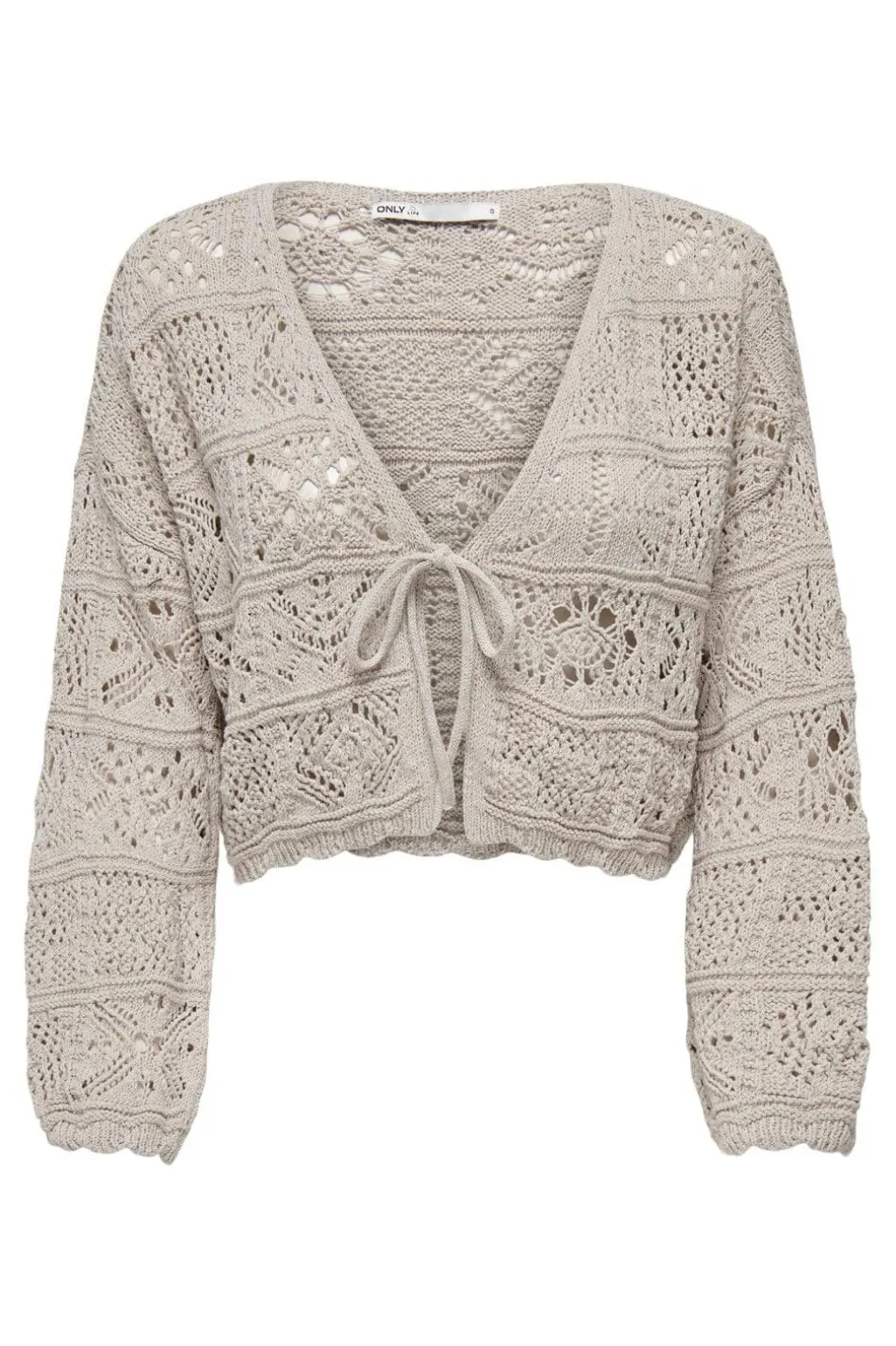 Lys grå cardigan fra Only med cropped design og åbent strikkemønster. Den har V-hals, 7/8-ærmer og bindebånd foran til justering af pasformen.