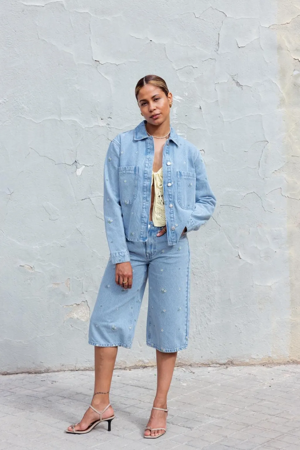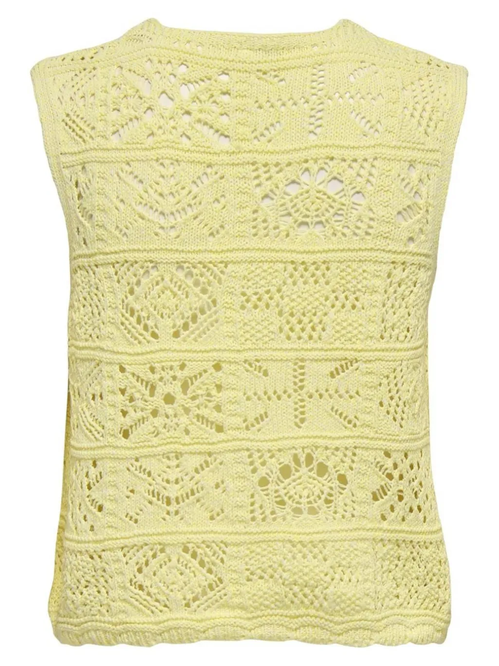Strikket vest fra Only i en lys gul farve. Den har hæklede detaljer, V-halsudskæring og bindebånd foran. Det ærmeløse design giver vesten et let og luftigt udtryk.