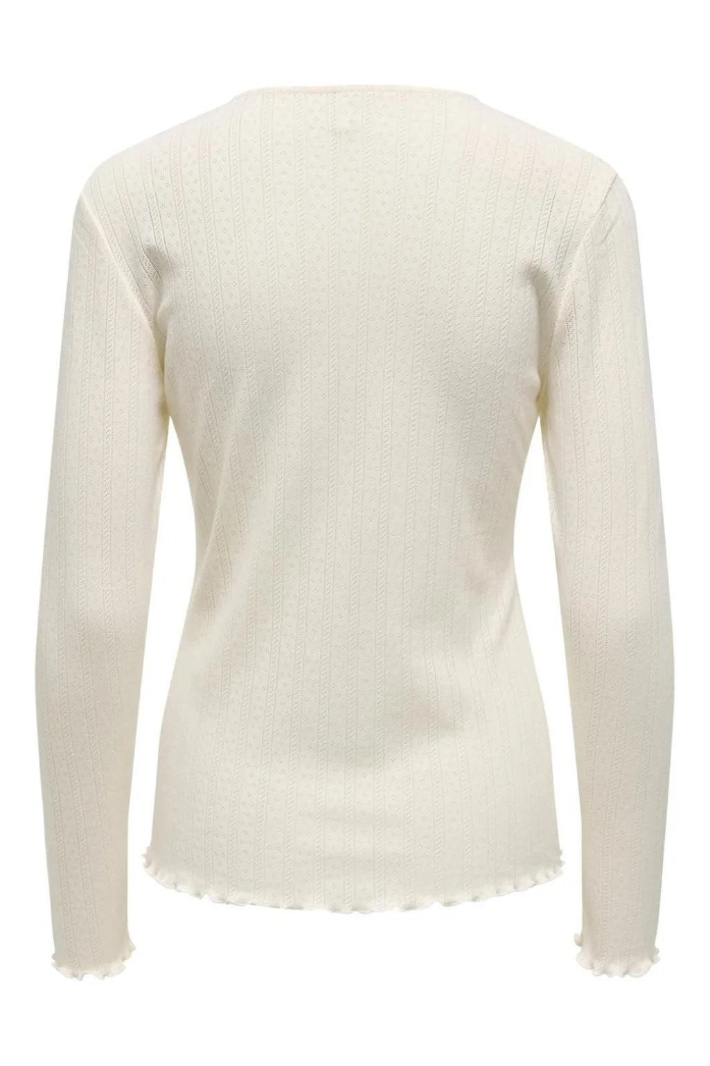 Langærmet top fra Only i cremehvid med ribbet struktur. Toppen har en rund halsudskæring og rynkede kanter ved ærmerne, hvilket giver et let udtryk.