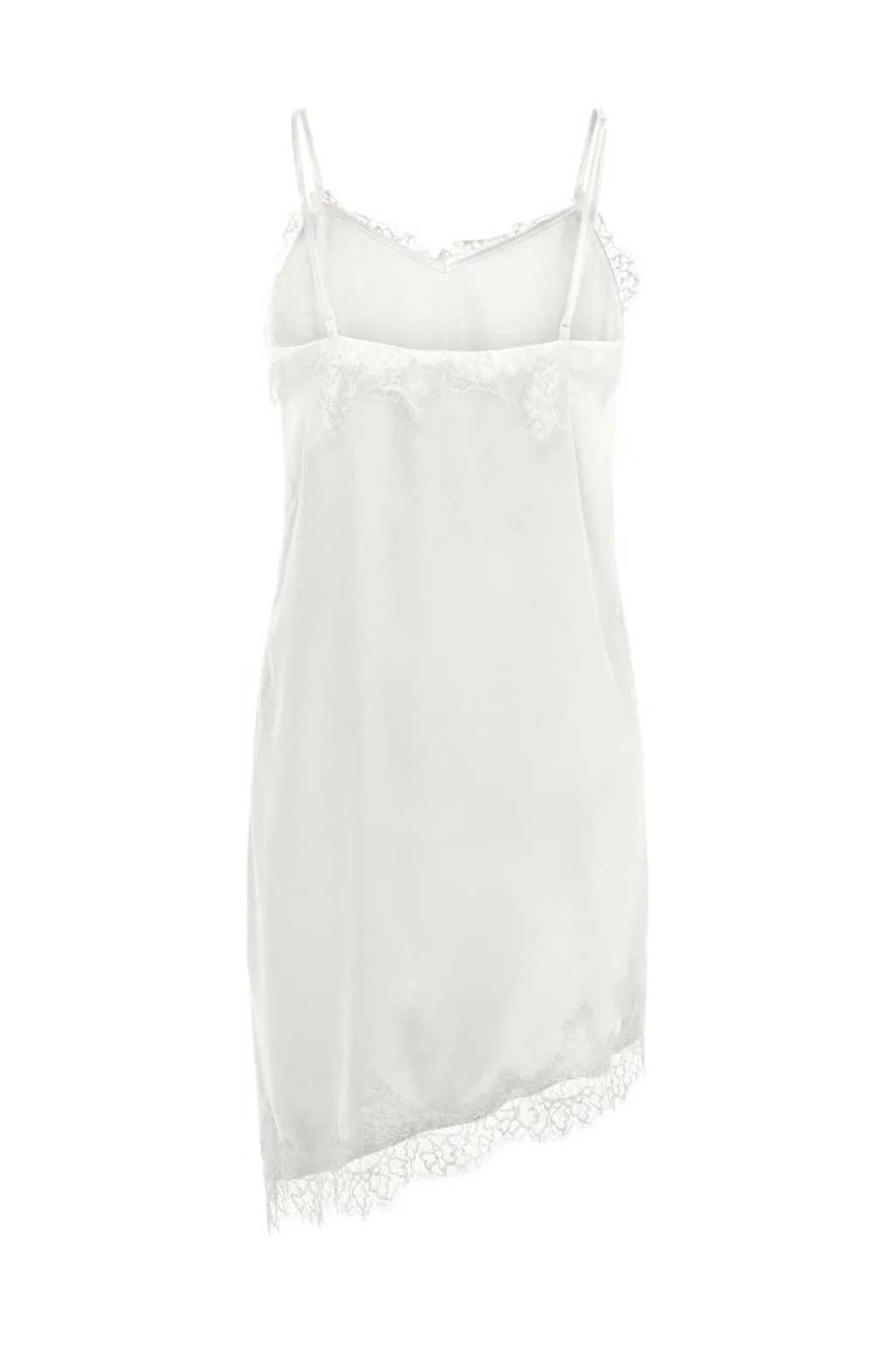 En hvid satin kjole fra Only med tynde stropper og blondedetaljer. Kjolen har en V-hals og en mellemlang længde.